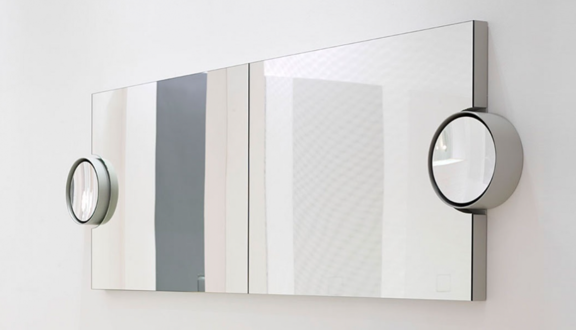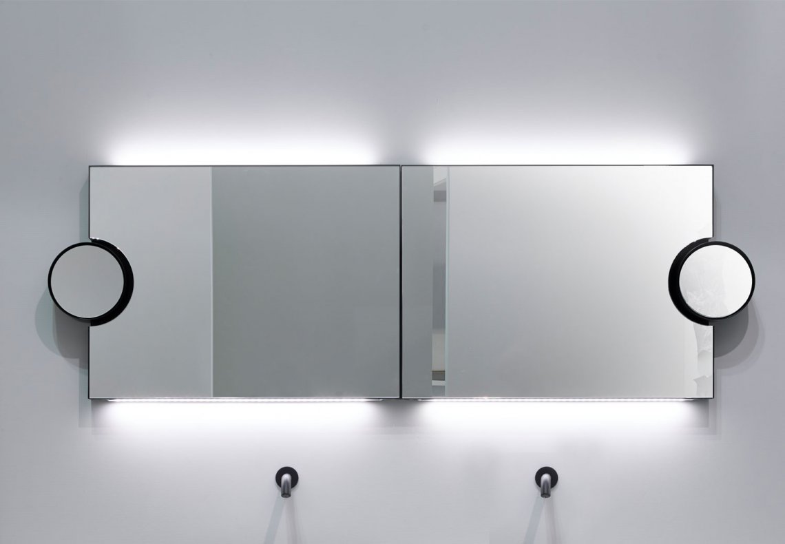 實用的長方形壁鏡,附有圓形側鏡 3 倍放大器,有多種不同的飾面,帶有禮貌的 LED 燈和光學開關。