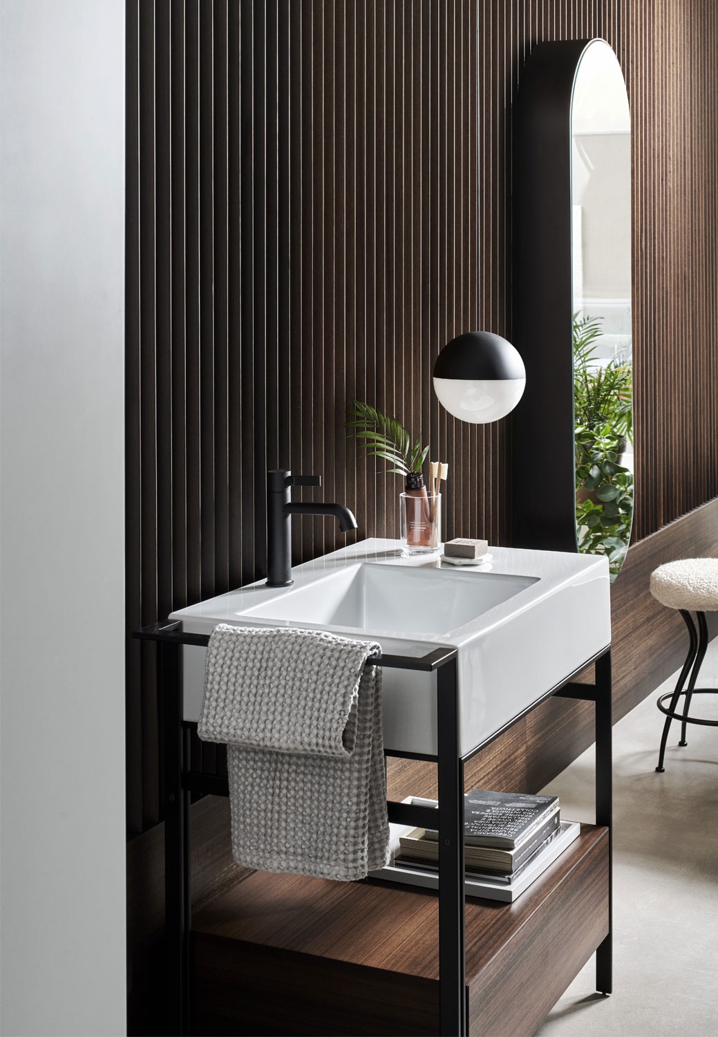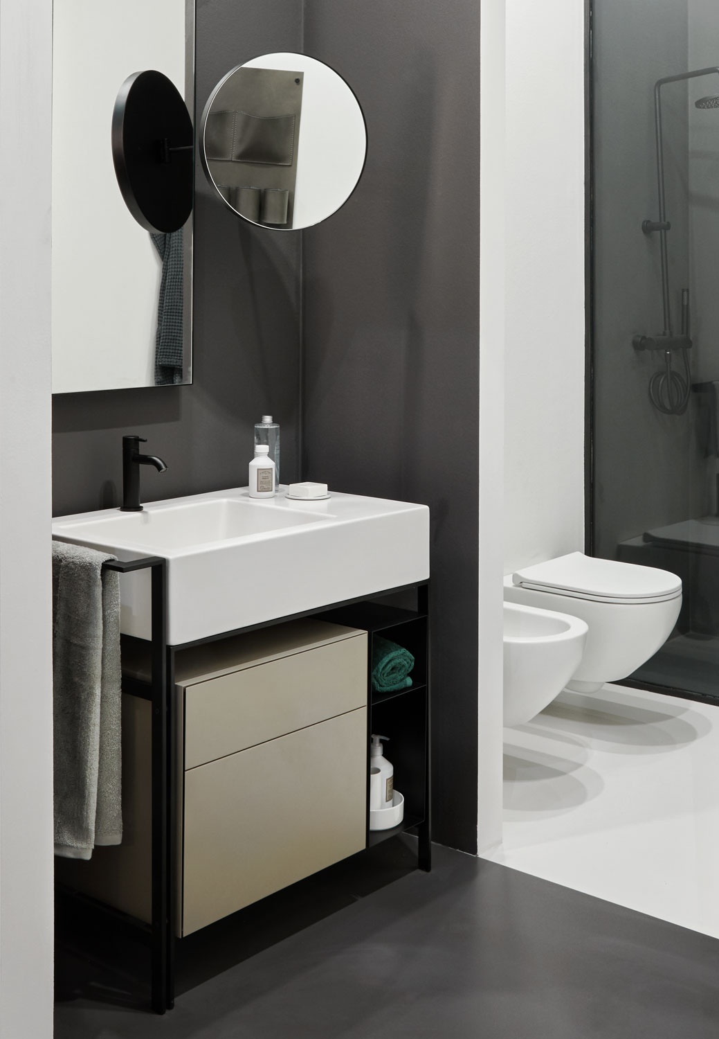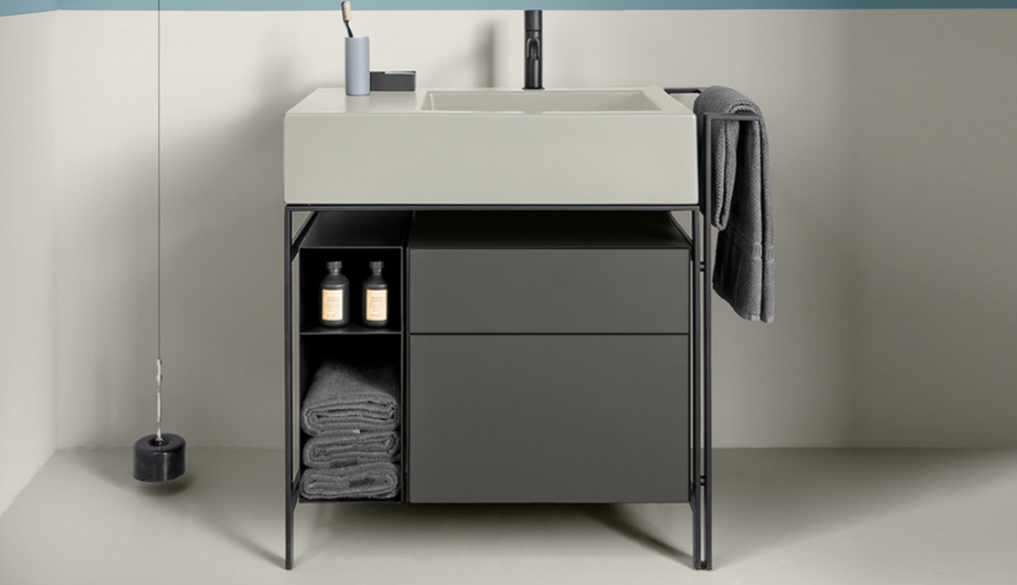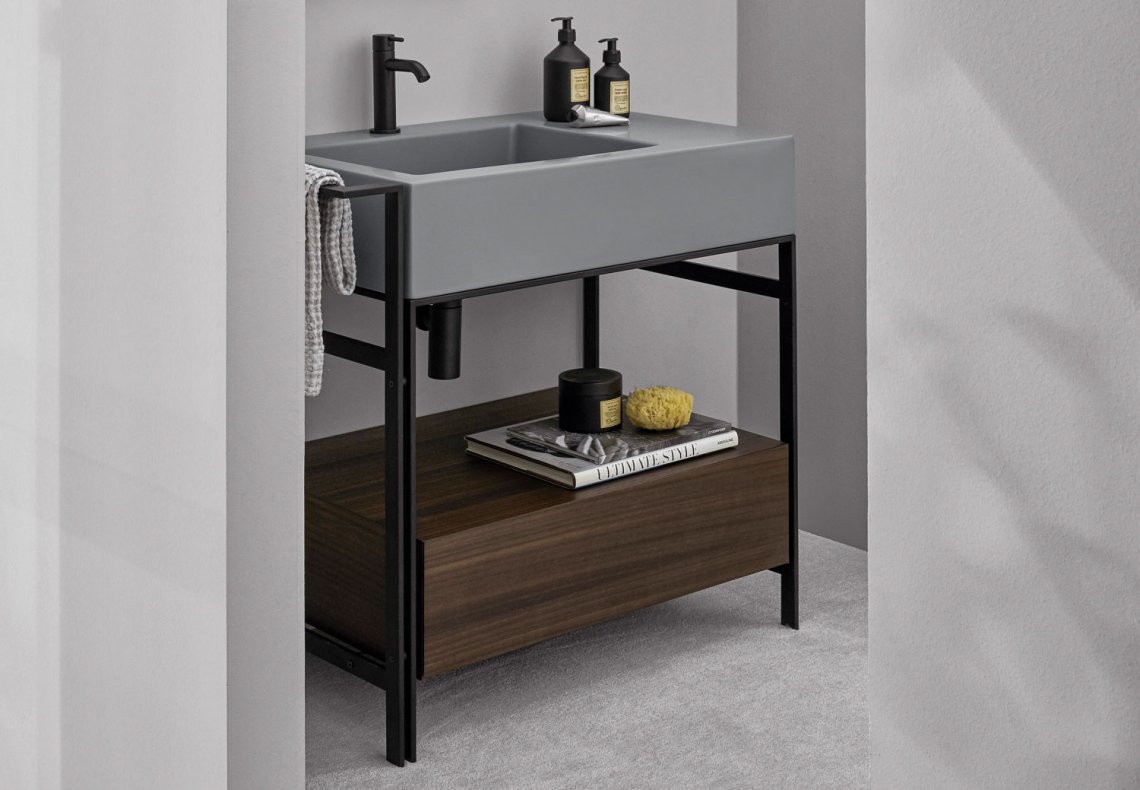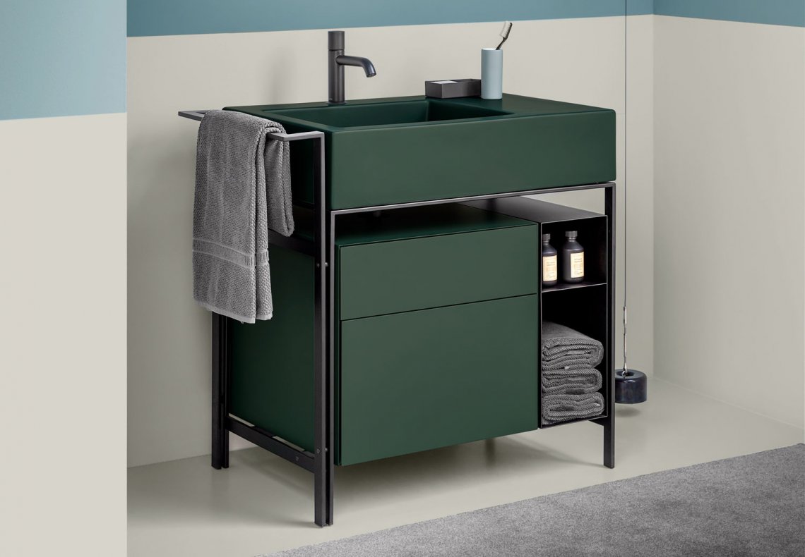 舒適洗臉盆的模塊化系統,帶側架,有多種飾面可供選擇。噴漆鋼結構可搭配實用的側毛巾架、同樣采用噴漆金屬的開放式物品架、漆木或木質飾面五斗柜和舒適的側邊皮革袋,或一個大矮抽屜,也可用作作為架子,有漆木或木質飾面可供選擇。實用的側邊皮革小袋完善了整個造型。