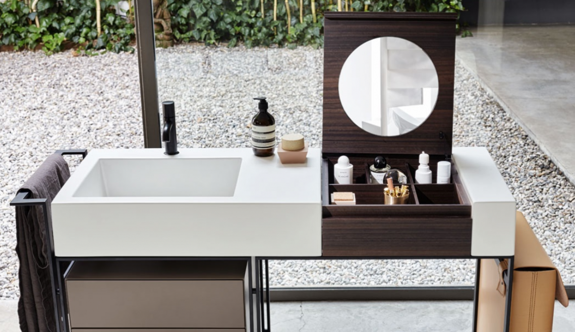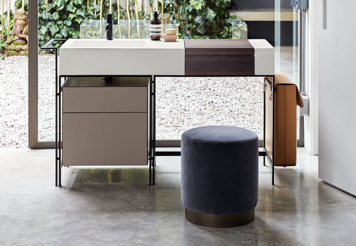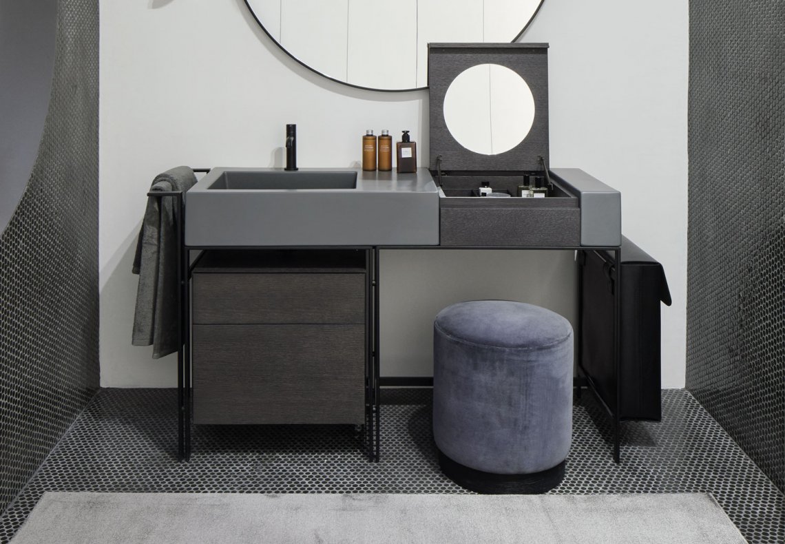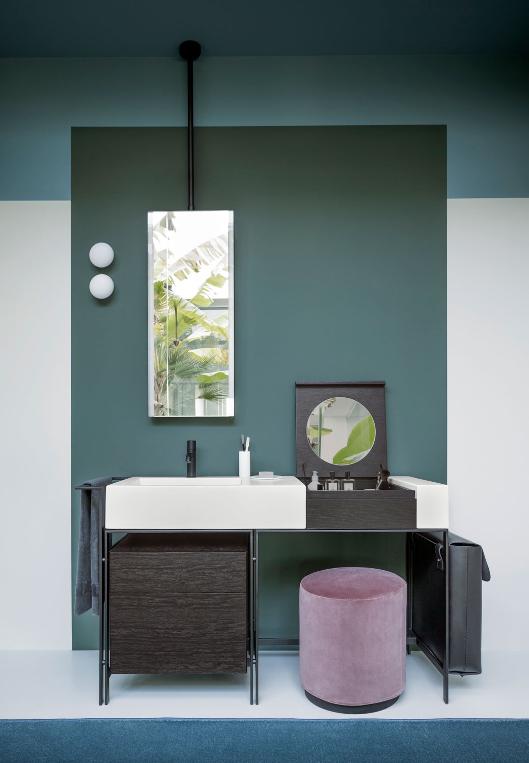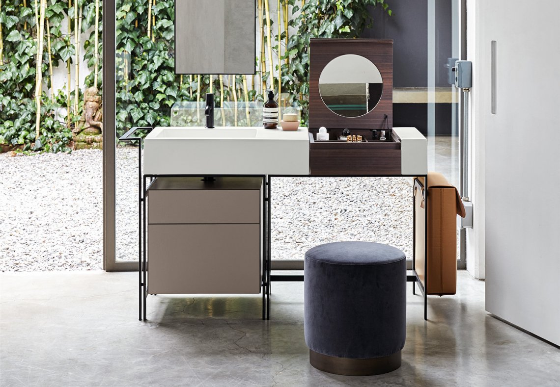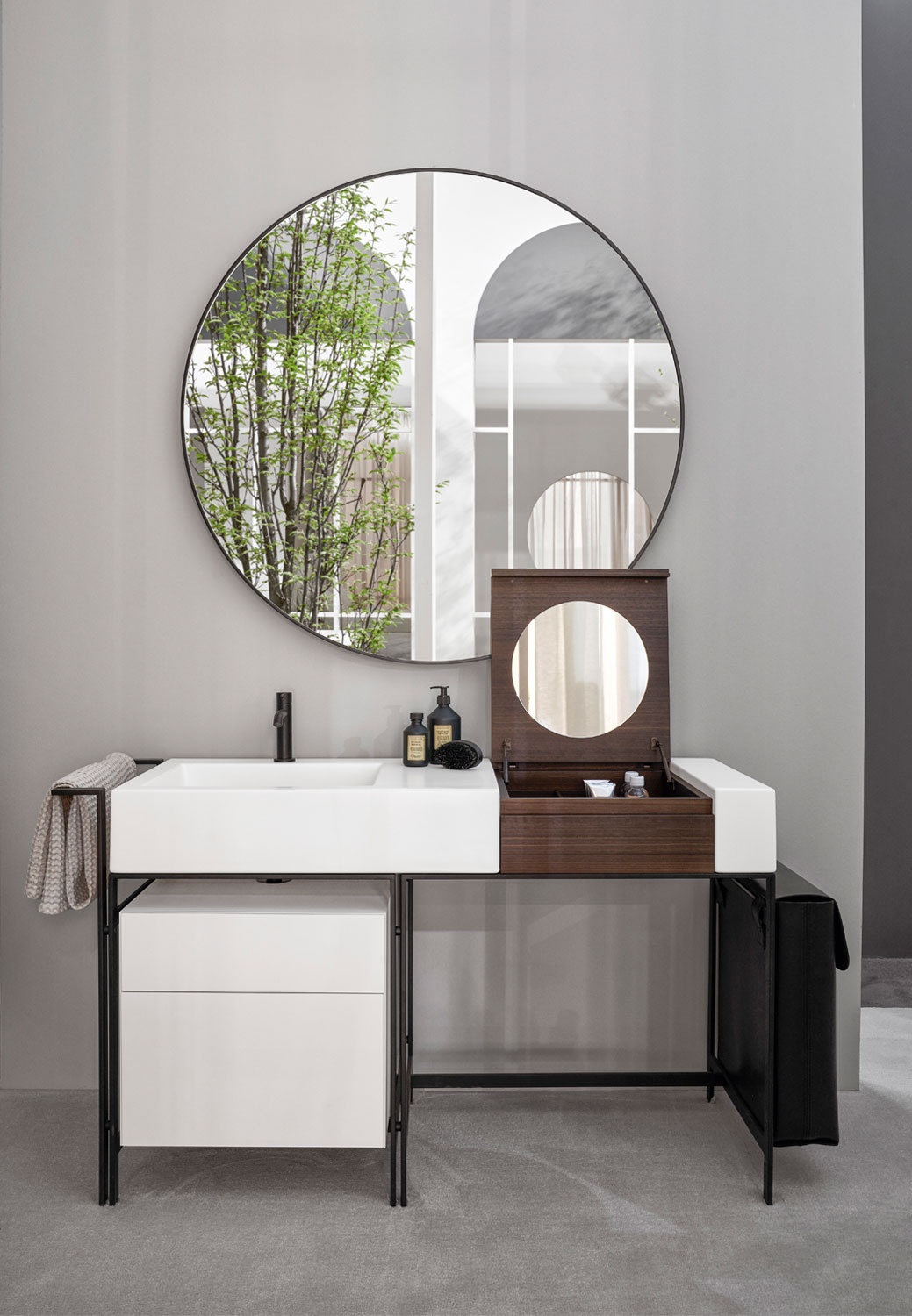 方便的洗臉盆的模塊化系統(tǒng),配有多種飾面的大型側(cè)臺(tái)面,結(jié)合帶可拆卸架子的木制化妝元件,有 Terre di Cielo 顏色系列的漆飾面或覆蓋采用珍貴的天然木材飾面。涂漆鋼結(jié)構(gòu)可以搭配實(shí)用的側(cè)毛巾架、漆木或木質(zhì)飾面的抽屜單元以及舒適的側(cè)邊皮革袋。