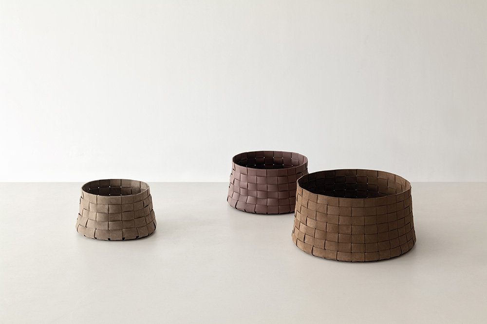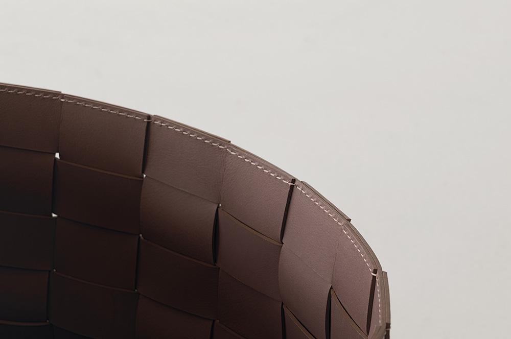 Dama container with black painted wooden base. Woven leather structure with special raw cut edges finishing available in three different leathers: Soffio, Setanil and Natural Velour. If no preference is specified, the edges feature tone-on-tone lacquering. Dama contenitore con base in legno verniciata nera. Struttura in pelle intrecciata con finitura cuoio disponibile in tre tipologie di pelle: Soffio, Setanil e Natural Velour. I bordi sono realizzati tono su tono se non viene specificata alcuna preferenza.