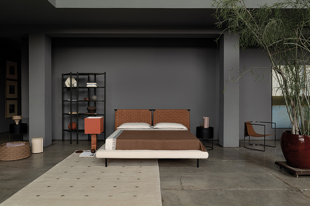 Jared bed with painted metal headboard available in two colors: Champagne and black. The headboard is decorated with woven leather with special raw cut edges finishing, available in three different leathers: Soffio, Setanil and Natural Velour. The standard finishing of headboard back-side, is made of black Romana leather, it is possible to have it in the same leather as the front with an up-charge. The wooden frame is covered with expanded polyurethane foam further covered with acrylic fiber. The metal feet are painted Champagne or black. If no preference is specified, the edges feature tone-on-tone lacquering. The matress is not included.
