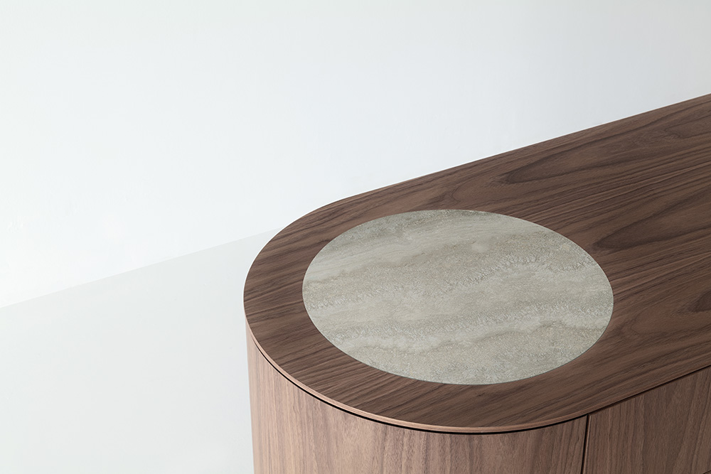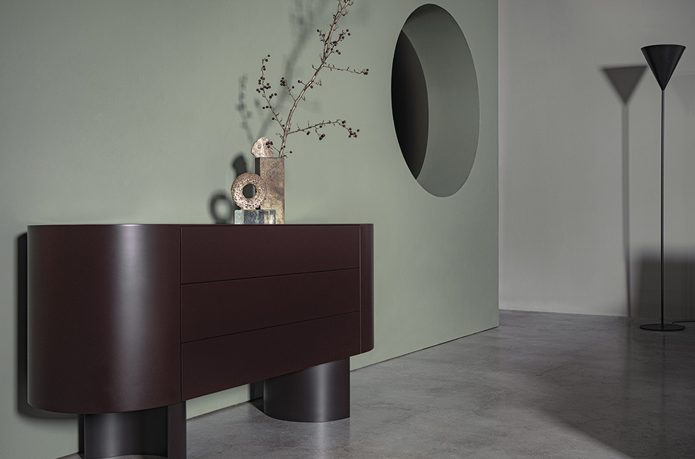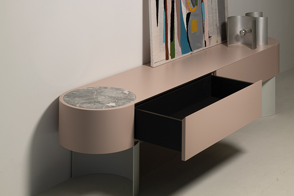 THE LARGE SUPPORTING STRUCTURE GIVES A FEELING OF HOSPITALITY, A WELCOMING ADDITION TO YOUR HOUSE. THE LIP SIDEBOARD HAS A LACQUERED BASE, AND BOTH THE INTERNAL AND EXTERNAL DESIGN INVOLVE A COMBINATION OF LINES AND CIRCLES. THE WHOLE STRUCTURE IS SUPPORTED BY ROUND ARCHES, WHILE THE SQUARE DRAWERS CONTRAST WITH THE CIRCULAR MARBLE TOP, CREATING A PARTICULAR IMPACT IN YOUR ROOM.