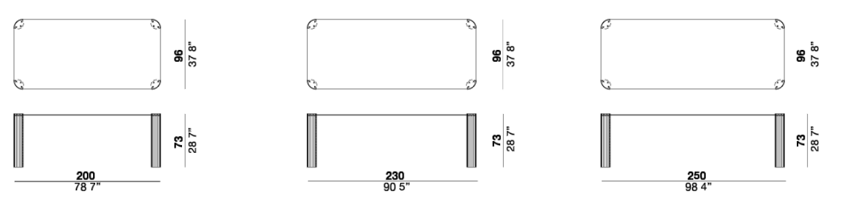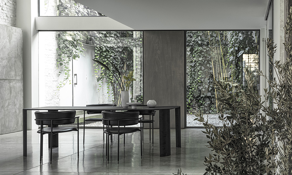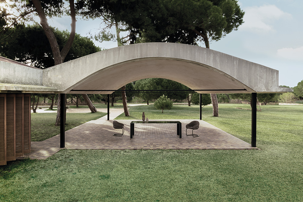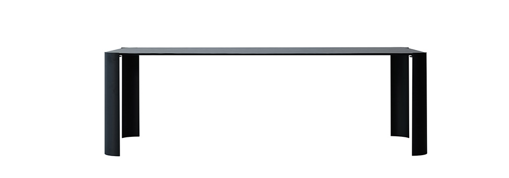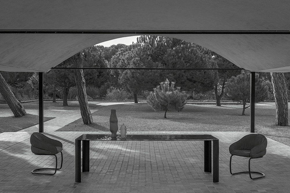 SOLID AND REASSURING IN ITS WOODEN-TOP VERSION, FLEETING AND EPHEMERAL IN ITS GLASS-TOP VERSION. THE EYE TURNS IMMEDIATELY TO THE LIGHTER MOTIVES ON THE TOP, GIVING THE ILLUSION OF TRICKLES OF WATER ON A SEA SHORE. THE ROUND LEGS CREATE AN IMAGINARY PROFILE THAT RISES FROM THE GROUND, GIVING FIRMNESS TO THE STRUCTURE.