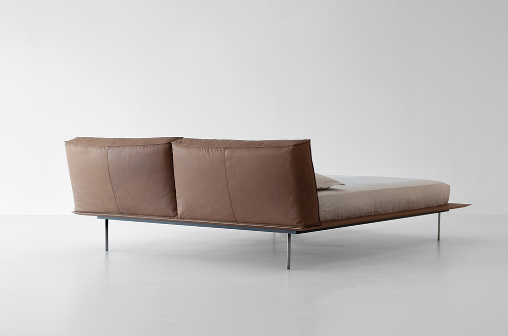 Vogue cuoio bed with a metal headboard upholstered with expanded polyurethane foam covered with acrylic silicon fiber. The sommier is made of painted metal with a leather-covered wooden frame with cuoio finish available in three different leathers: Soffio, Setanil and Natural Velour. The metal feet are available in bright chromed or black chromed. If no preference is specified, the edges feature tone-on-tone lacquering. Mattress is not included. Please note: single wooden slat included in the bed.