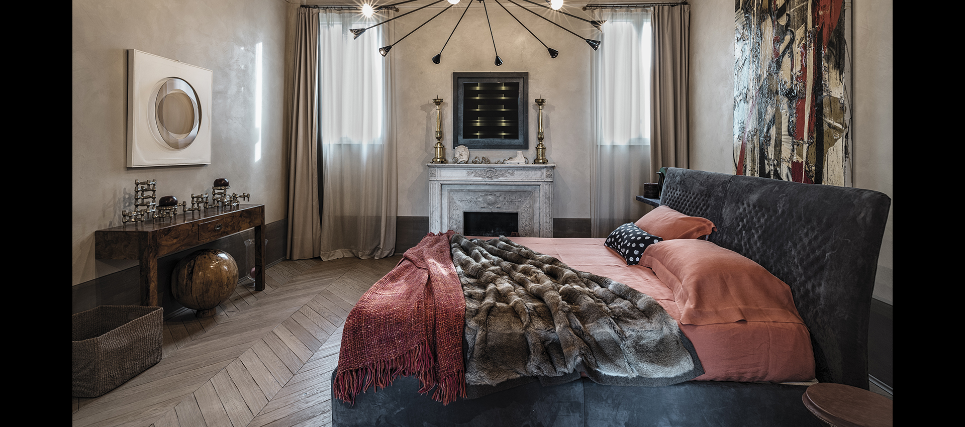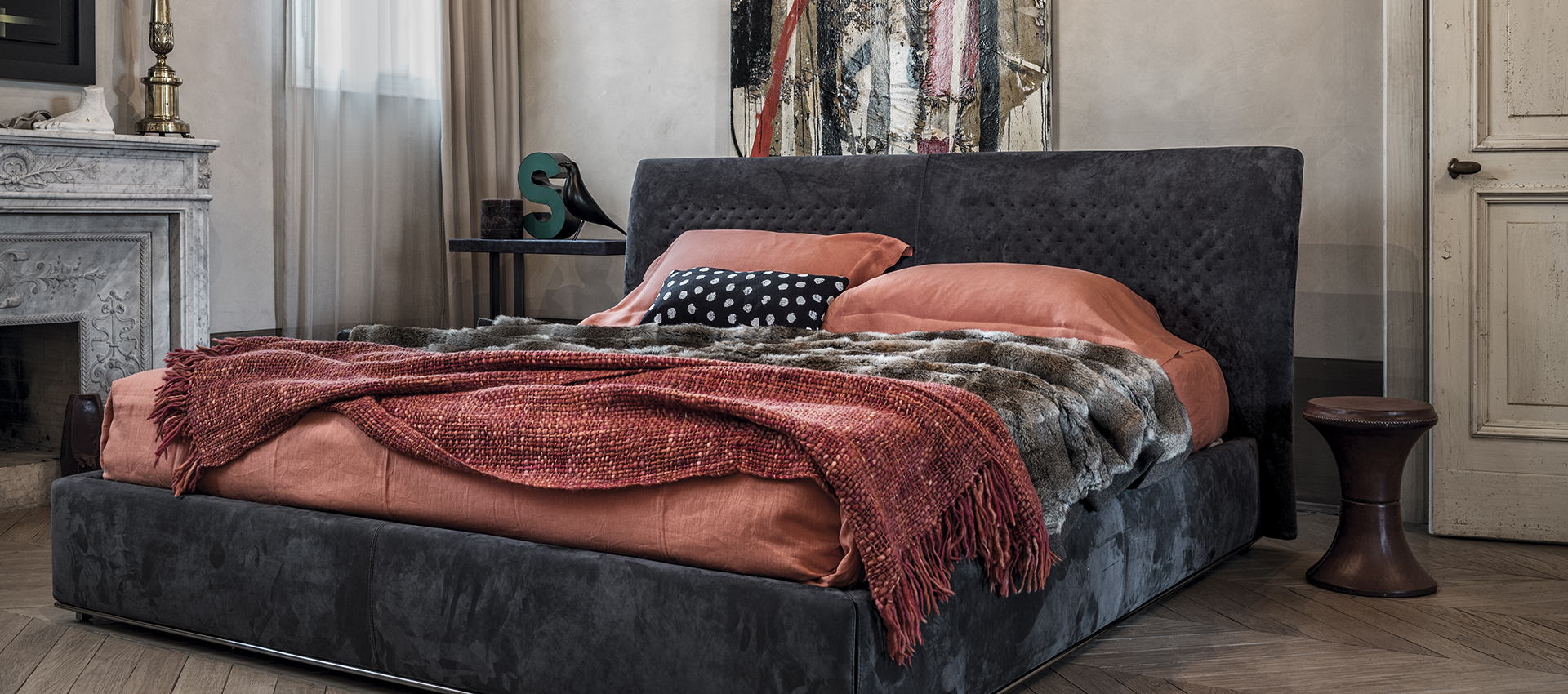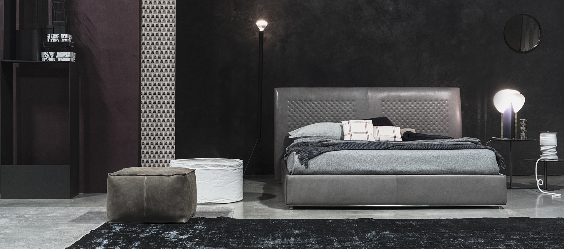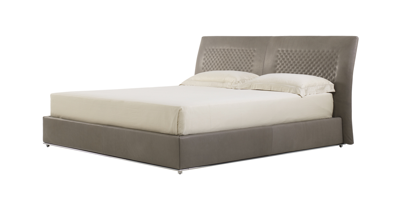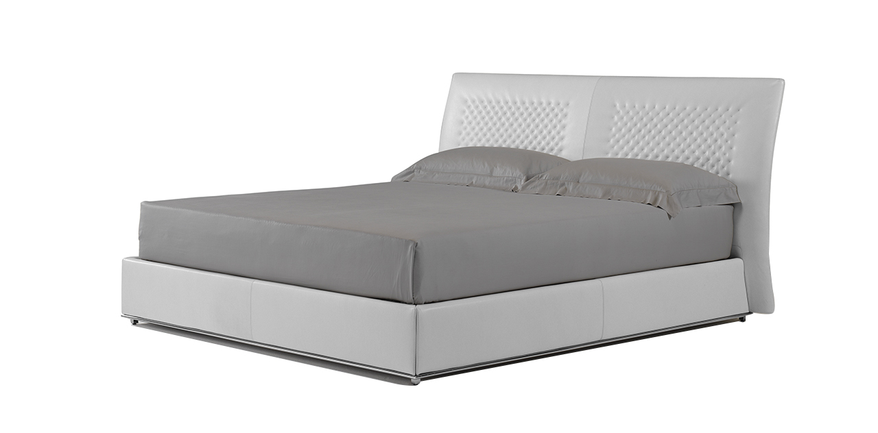 Bed with metal headboard upholstered in polyurethane foam with capitonné worked-