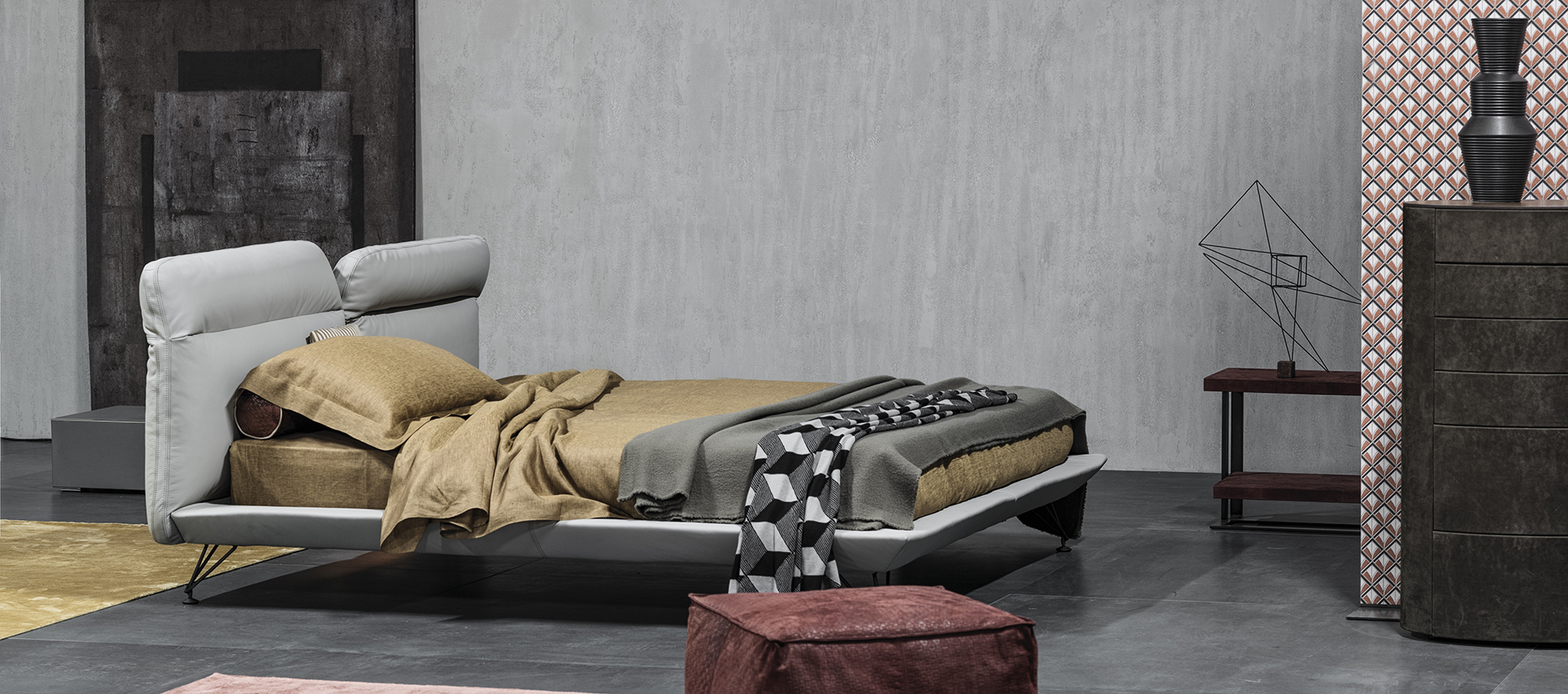 Bed with reclining metal headboard upholstered in polyurethane foam