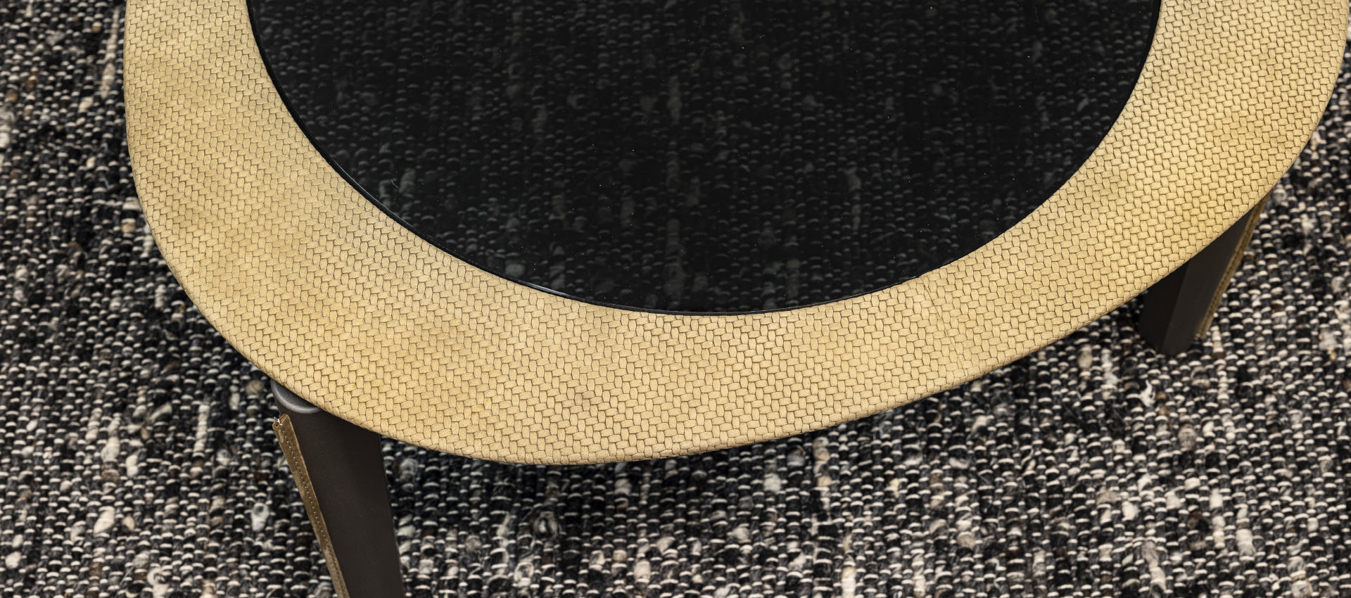 glass top surrounded by a worked leather frame. no edges for this rounded design coffee table. thin feet in painted wood with leather detail. a decidedly light and versatile line capable of combining different and complementary materials.