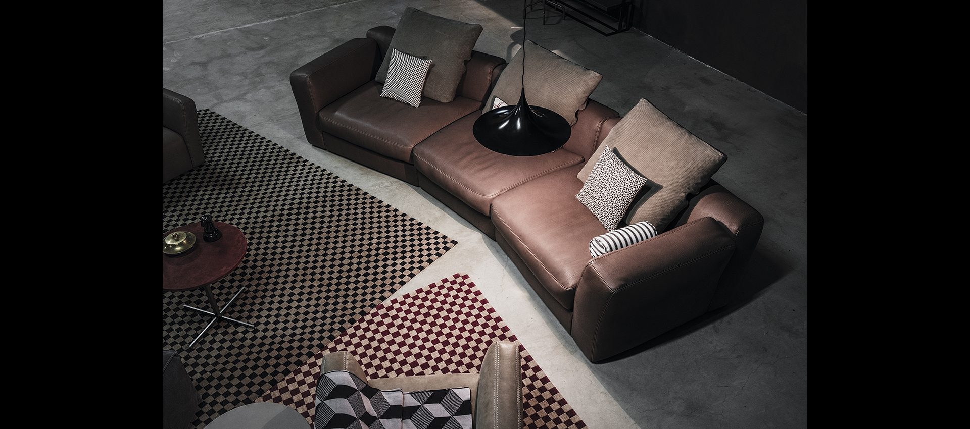 Modular sofa with wooden frame and support of woven elastic ribbons. THE