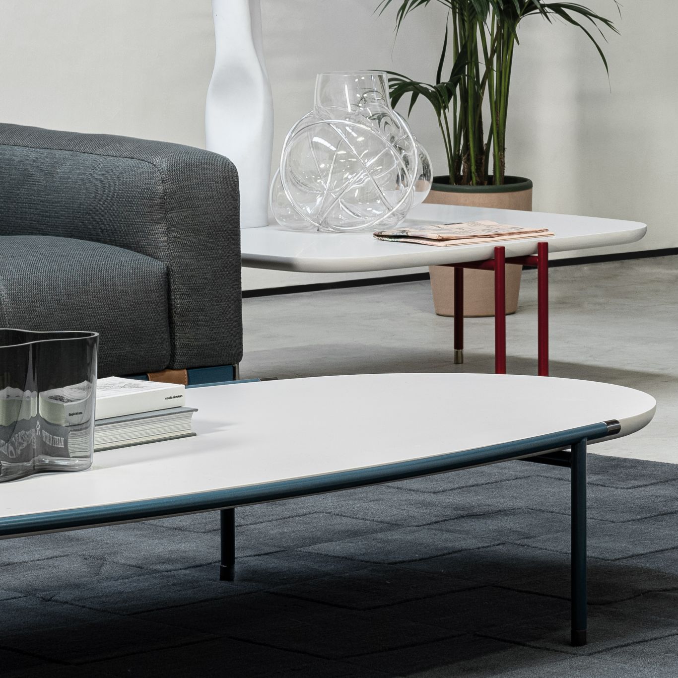 Tavolini leggeri, disponibili in due dimensioni e forme. Il top laccato opaco, disponibile in 7 colori, è fissato al telaio, le sottili gambe sono impreziosite da terminali cromati nelle finiture Standard, Nero e Oro. Tutto soddisfa il bisogno di spazio e il gusto estetico grazie a materiali sostenibili, per costruire gli ambienti del futuro.