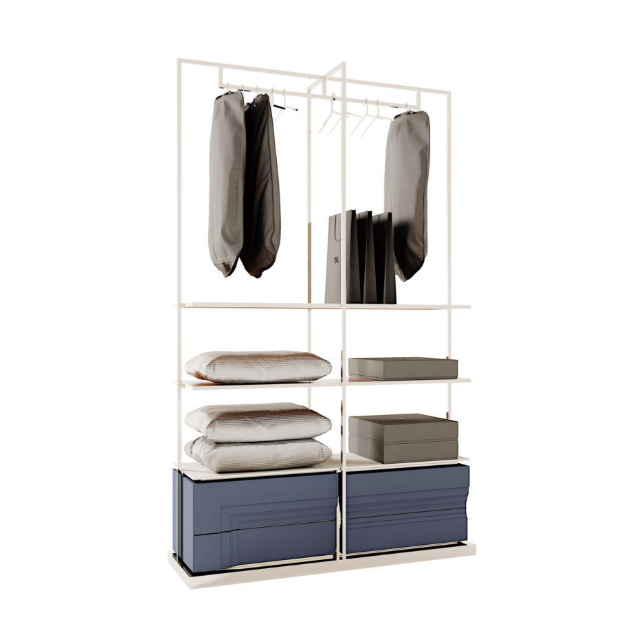 Struttura in legno multistrato laccato. Interno cassetti laccati. Struttura sovrastante e supporto per appendini in tubolare metallico. Basamento in legno massello rivestito in metallo. Ripiani in legno rivestiti in pelle o tessuto non sfoderabile con profili in metallo.