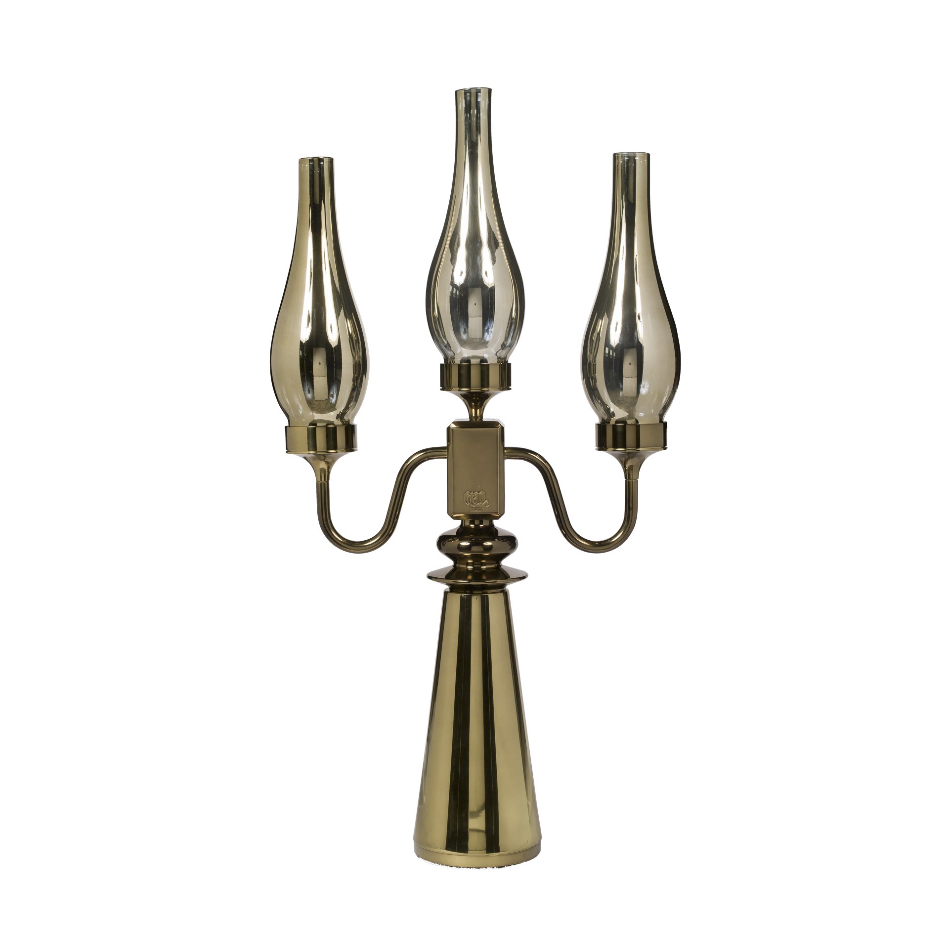 Struttura in ottone. Bicchieri in vetro con particolare lavorazione a specchio. Copri lampadina interno in vetro sagomato sabbiato. Cavo in maglia metallica finitura bronzo. 3 lampadine LED G9 220 volt.
