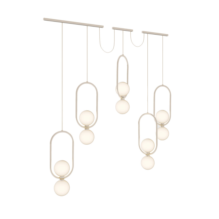 Struttura tubolare metallica. Sfera in vetro opale. Cavo in maglia metallica finitura bronzo. Lampadina LED G9 220 volt.