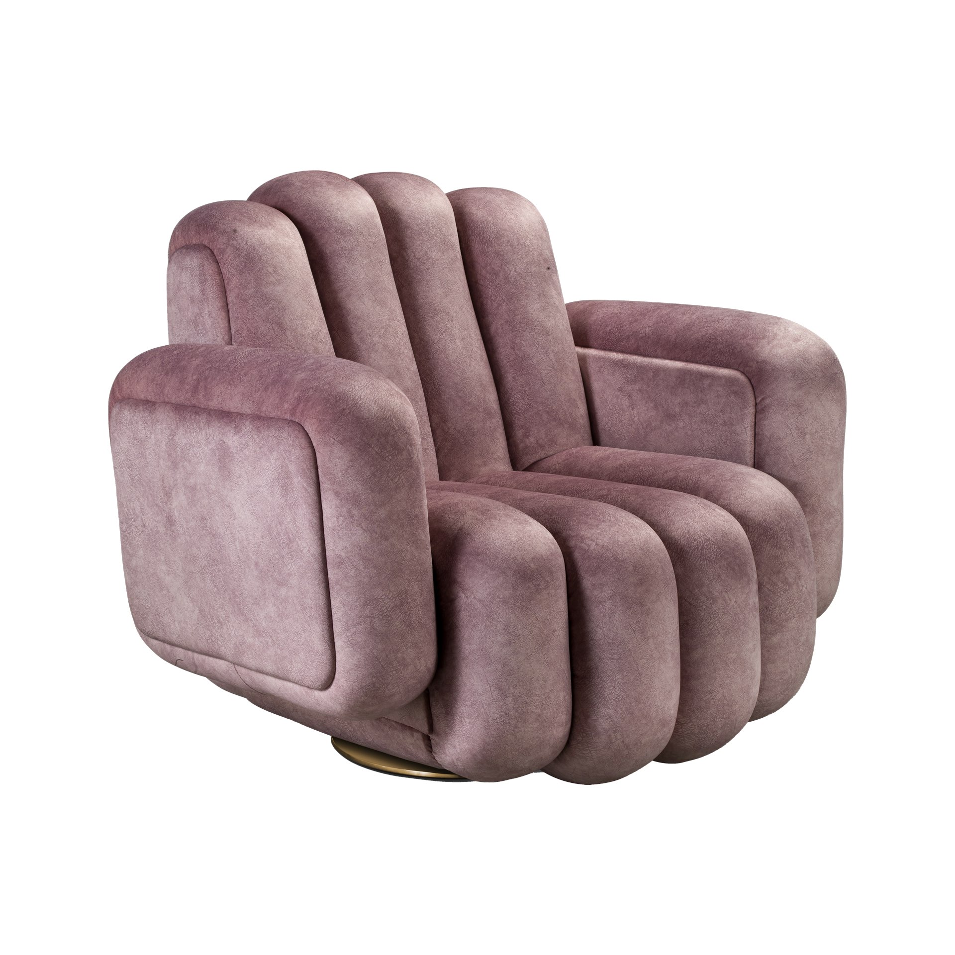 Struttura sagomata in legno di pioppo. Sistema girevole. Rivestimento in pelle o tessuto non sfoderabile. Imbottitura in poliuretano espanso. Base in metallo.