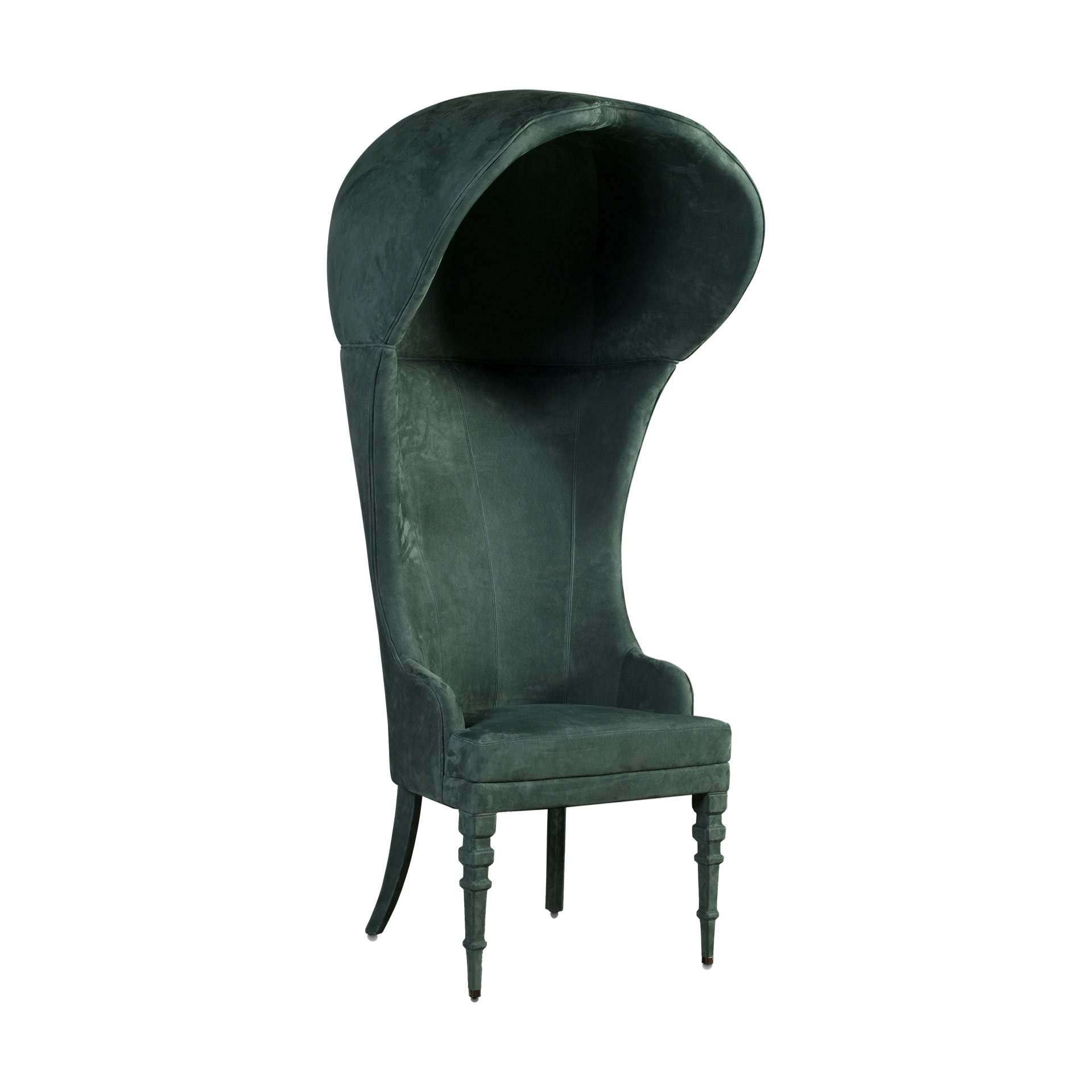 Struttura in legno di faggio. Rivestimento in pelle o tessuto non sfoderabile. Imbottitura in poliuretano espanso. Profili in pelle o tessuto non sfoderabili. Schienale a cappuccio. Puntali in ottone.