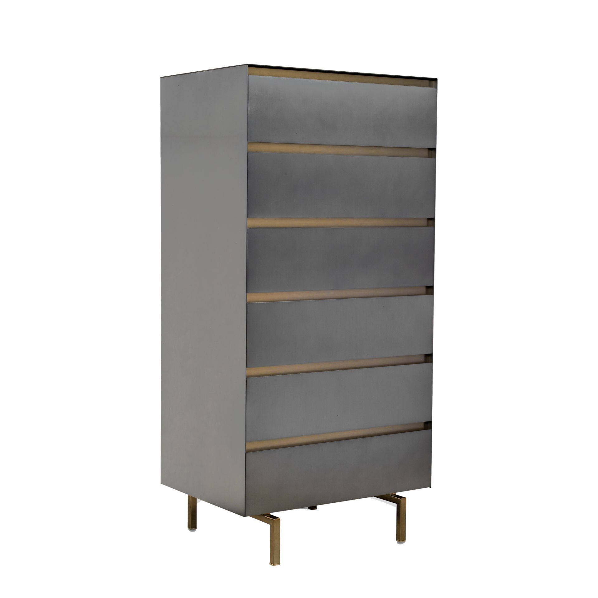 Struttura in legno rivestita esternamente in lamiera verniciata e inserti in metallo con finitura ottone. Basamento in tubolare di metallo con finitura in ottone. Interno cassetti laccato satinato.