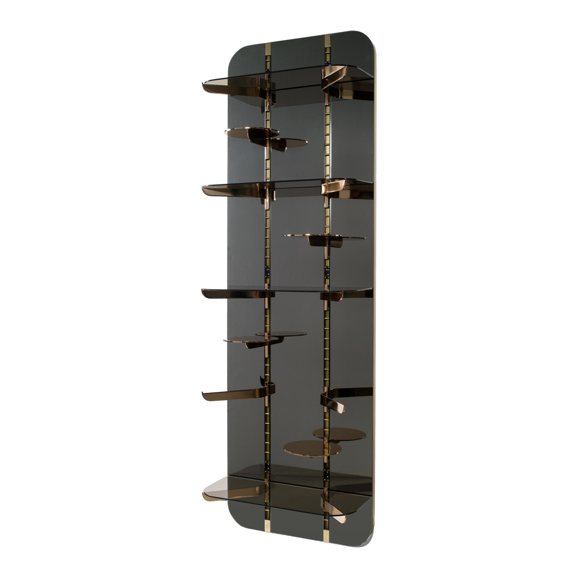 Struttura in legno. Vetro a specchio. Cremagliere e reggipiani in metallo. Ripiani in metallo e vetro colorato temperato.