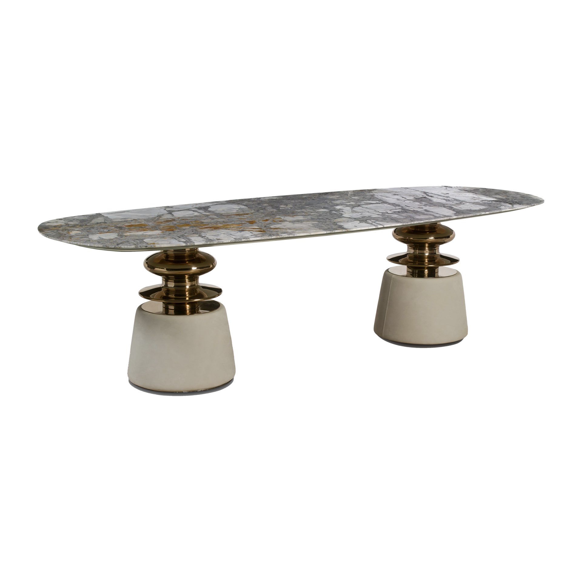 Struttura base in legno di pioppo rivestita in pelle o tessuto non sfoderabile. Imbottito in poliuretano espanso. Componenti e dettagli in metallo. Top in Marmo o Vetro.