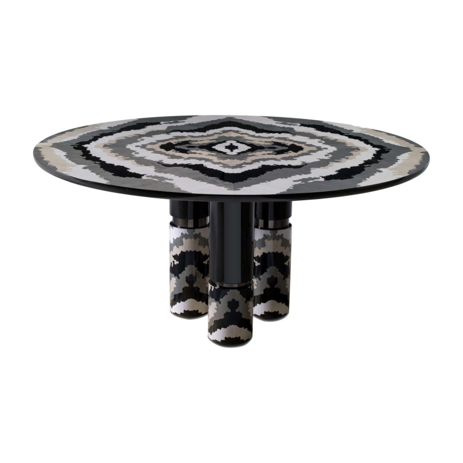 Struttura e sottotop in legno laccato. Sezione gambe e top impiallacciate in finitura Mimetica. Dettagli in metallo.