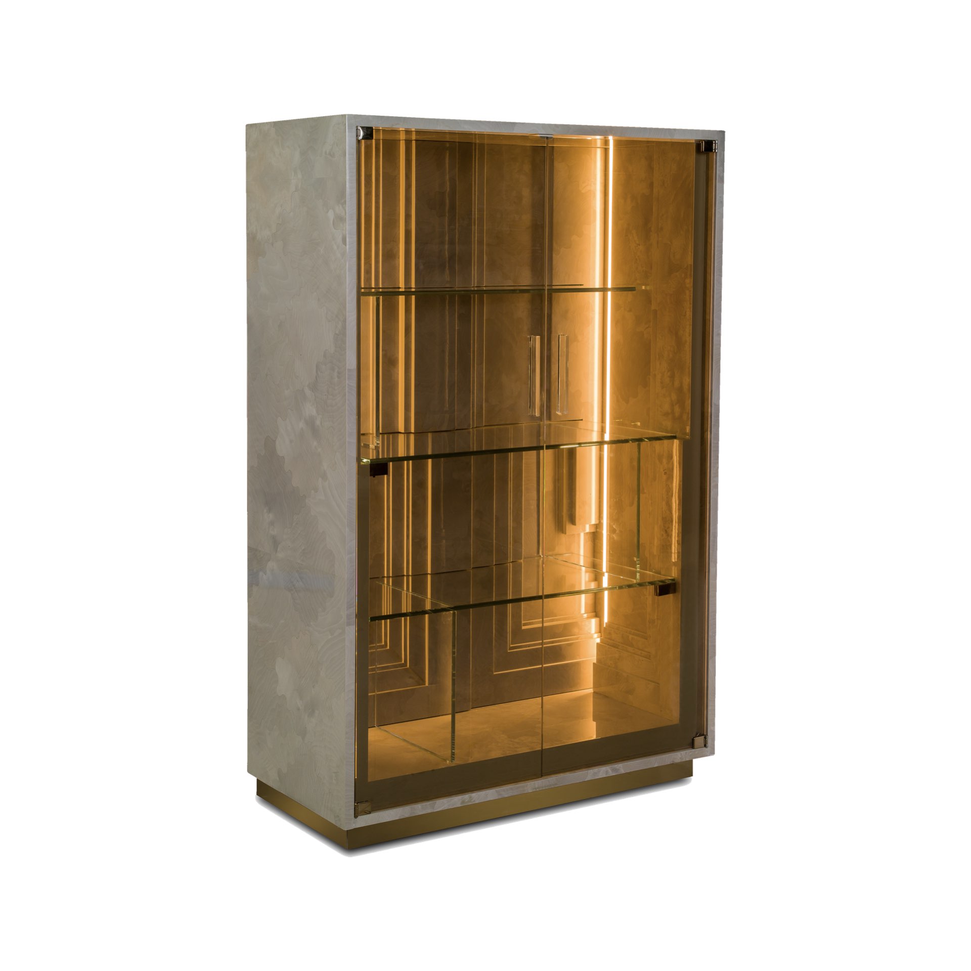 Struttura in legno listellare laccata lucida. Ante e mensole in vetro temperato colorato trasparente con spessore 8mm. Interno struttura a rilievo con pannelli scomposti. Basamento in legno rivestito in metallo.
