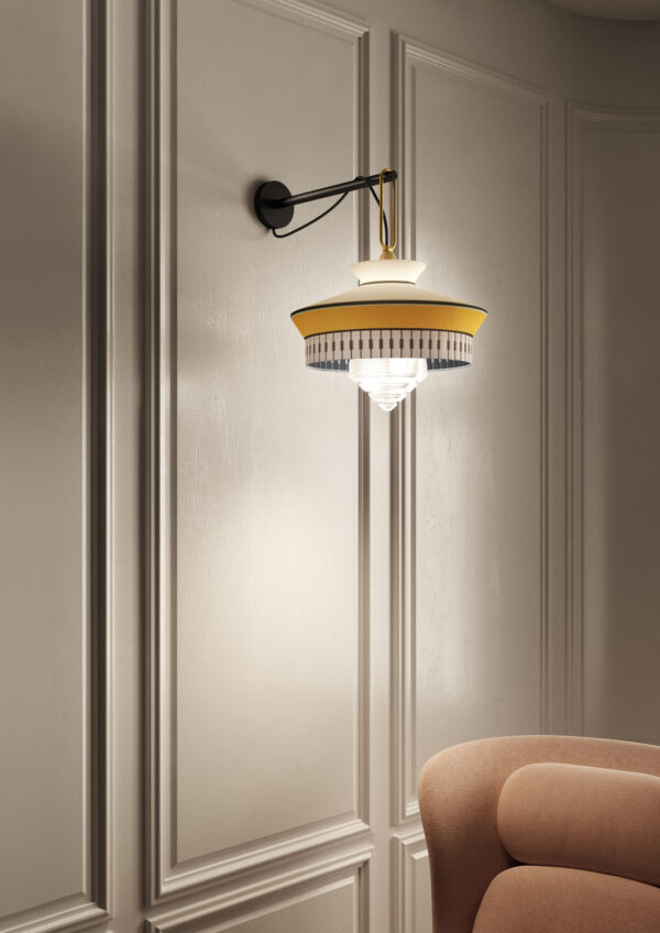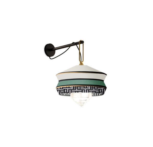 La versione applique è caratterizzata da un braccio sottile ed elegante con finitura laccato nero seta opaco e un anello in ottone satinato che sorregge la lampada.