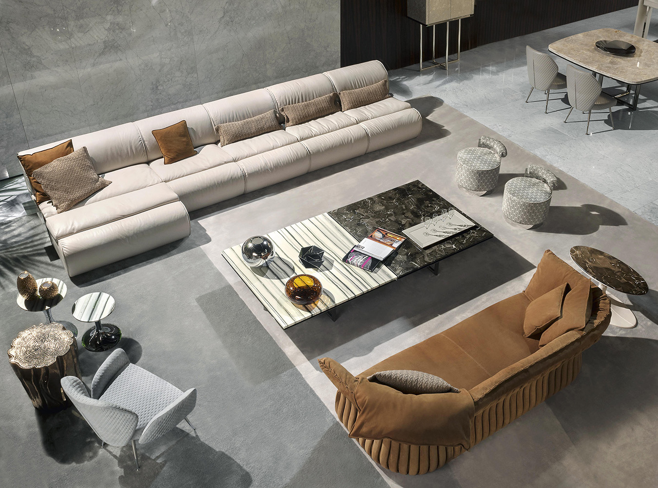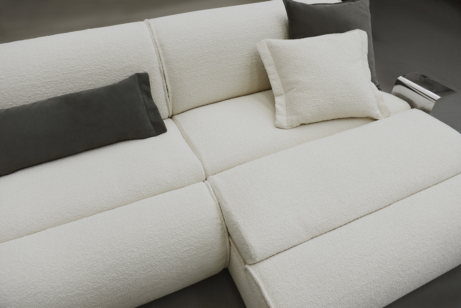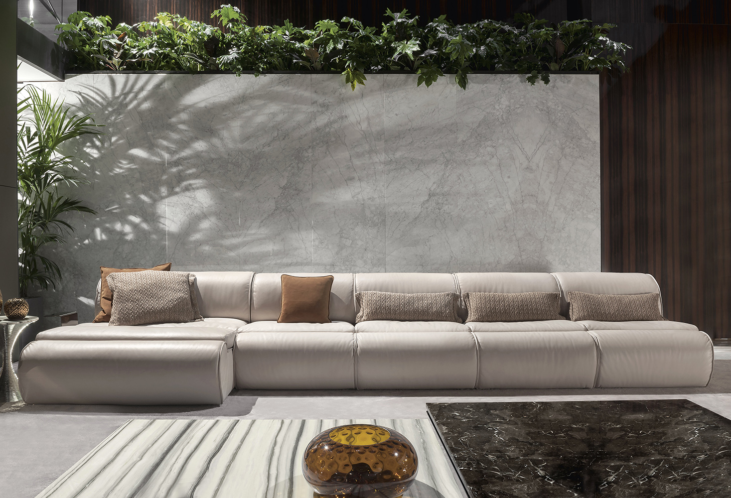 Inspired by the legendary 1970s, Denver is a combination of perfectly balanced shapes, whose design is clearly visible from the side. Each module is composed of two elements: the main body with a full shape that rests on the ground and the seat cushion coming out of the body itself. It is available in leather or fabric. Three units with different depths and widths, can be combined to create an infinite number of compositions able to meet space requirements and comfort expectations.