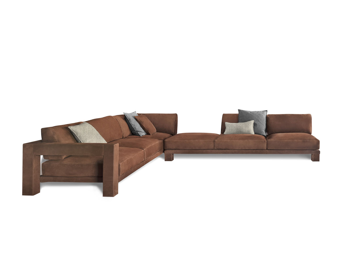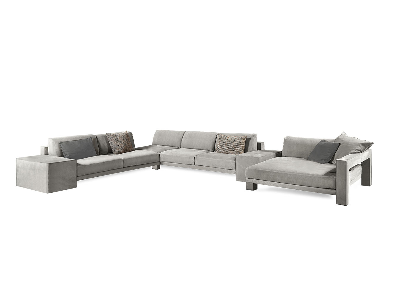 Vision modular sofa is an attractive proposal for fans of square shapes. This item with an essential but sophisticated design makes geometric simplicity its strength, expressing modernity and harmony of proportions. The various available modules allow to create many customised combinations, in order to meet the needs of each customer. The structure of Vision elements has a square section that is completely upholstered with fabrics or leathers, obtaining a perfect balance of volumes, where soft pillows ensure a pleasant sense of relaxation. The external structure of the sofa is accurately upholstered using a sophisticated technique that allows to cover each individual panel without seams.