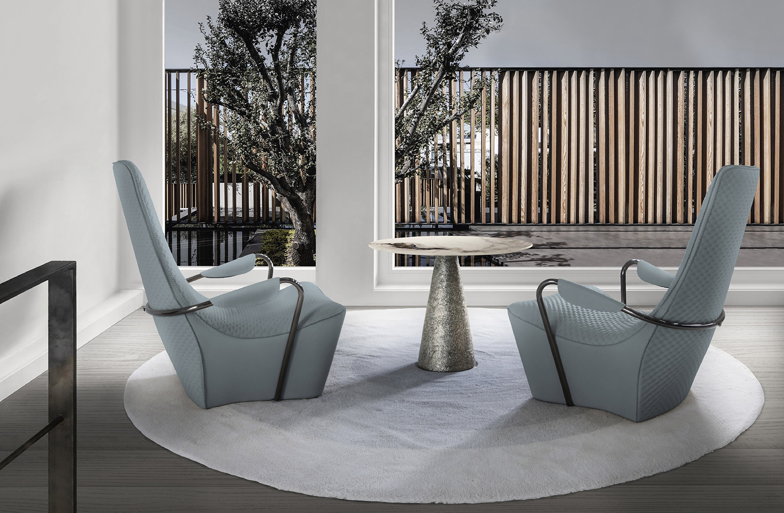 Comfortable and elegant, Wave armchair has found its inspiration in “bergere” armchairs very popular during the first half of last century. Its lines appear very contemporary and they are defined by a tubular metal element that envelops the entire structure and becomes functional as armrest on both sides. Fabrics and leathers used as upholstery are decorated with a “dot” pattern embroidery able to enhance a great comfort. Its ergonomic and refined shape conveys a meditative feeling.