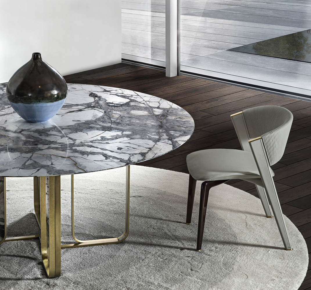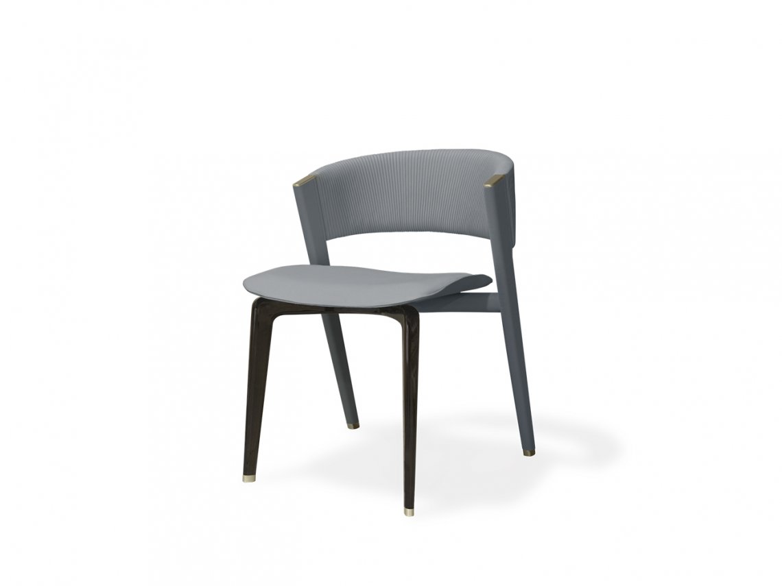 Designed to be matched with Nova table, Lisbona chair is suitable also for other tables placed in different living areas: the look of this item is refined and its proportions have been thought to grant the best comfort. The front legs are realized with maple tree wood lacquered with dark brown colour while the frame and back legs upholstered with leather, present refined brushed metal details on the upper part. The back legs,a bit reclined internally, sustain an enveloping leather back embroidered with “plissè” effect while the seat, that is upholstered too, exalts the shape of this chair showing the cross detail that joins the legs.