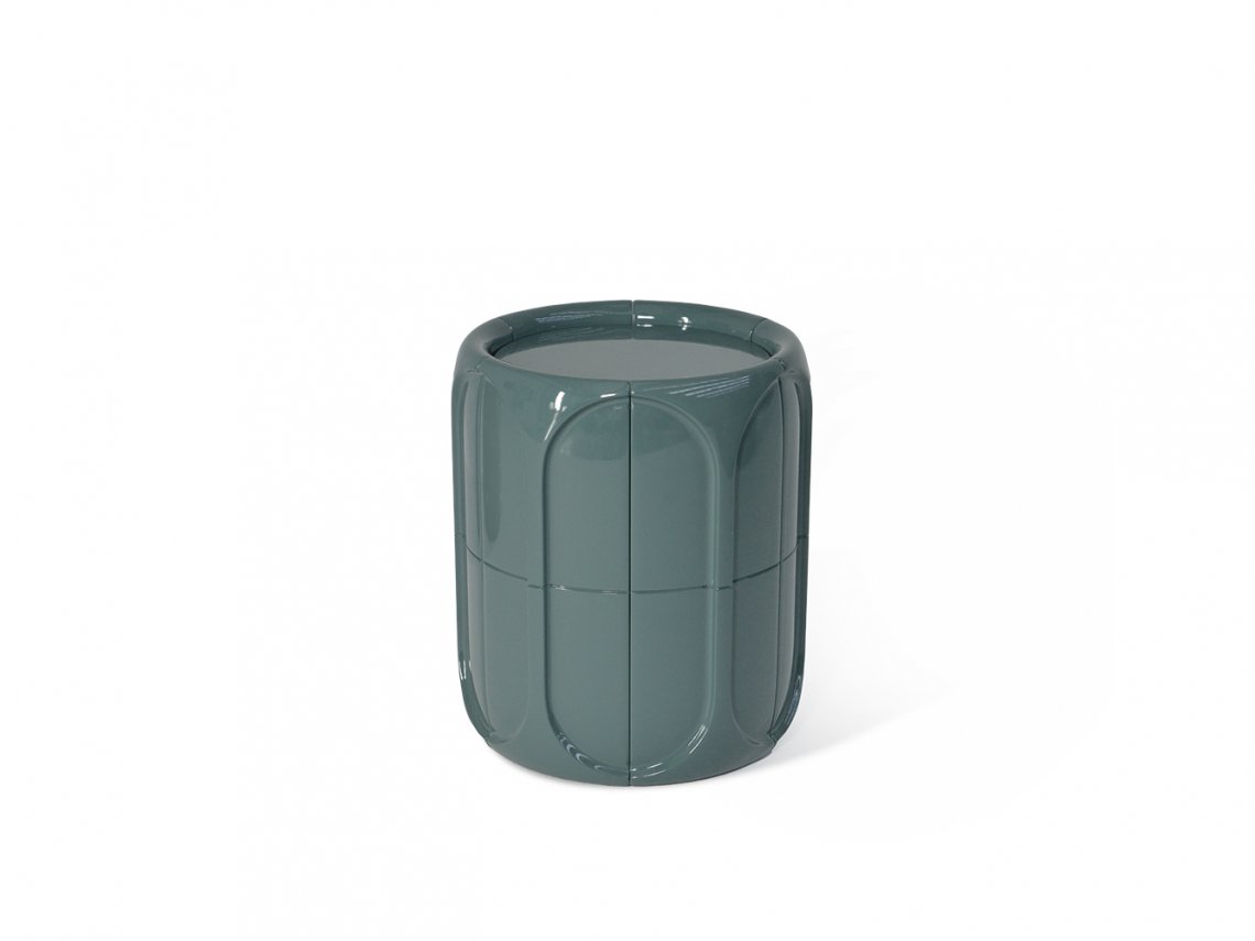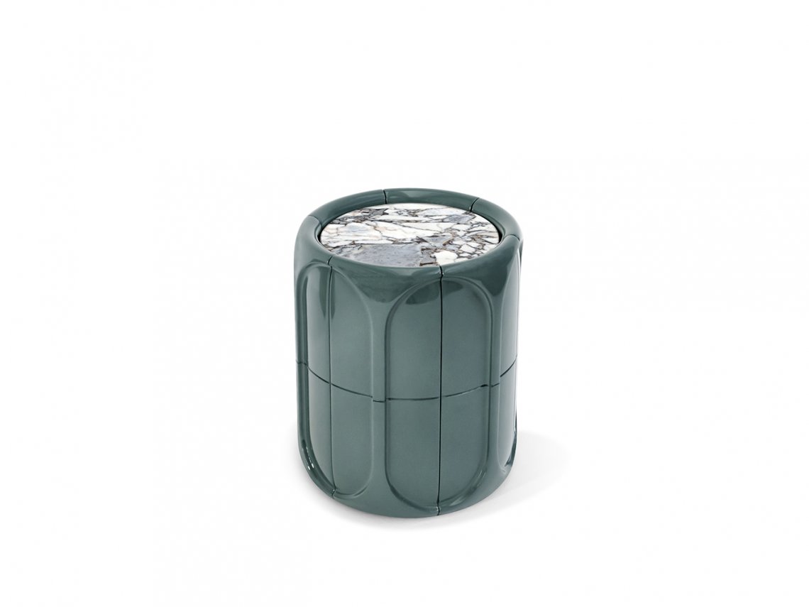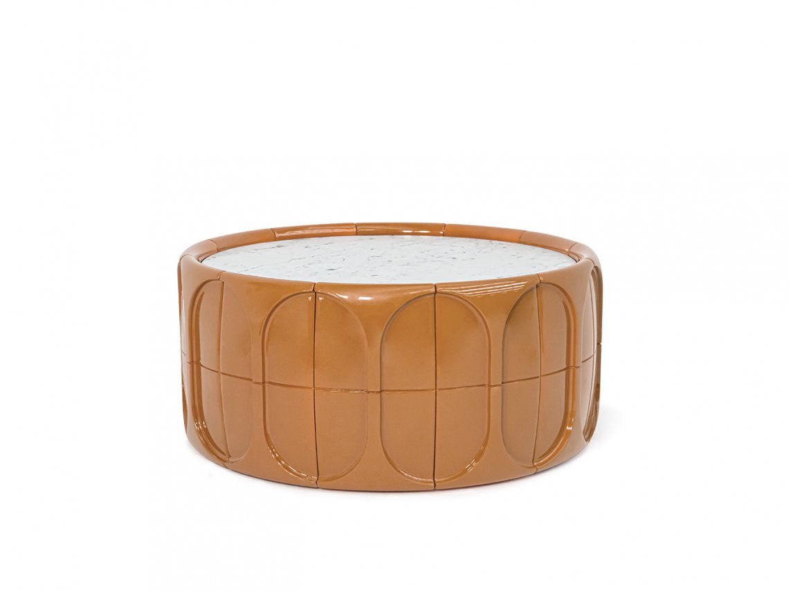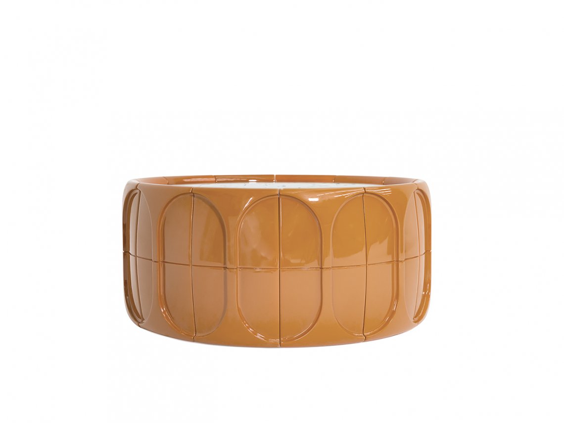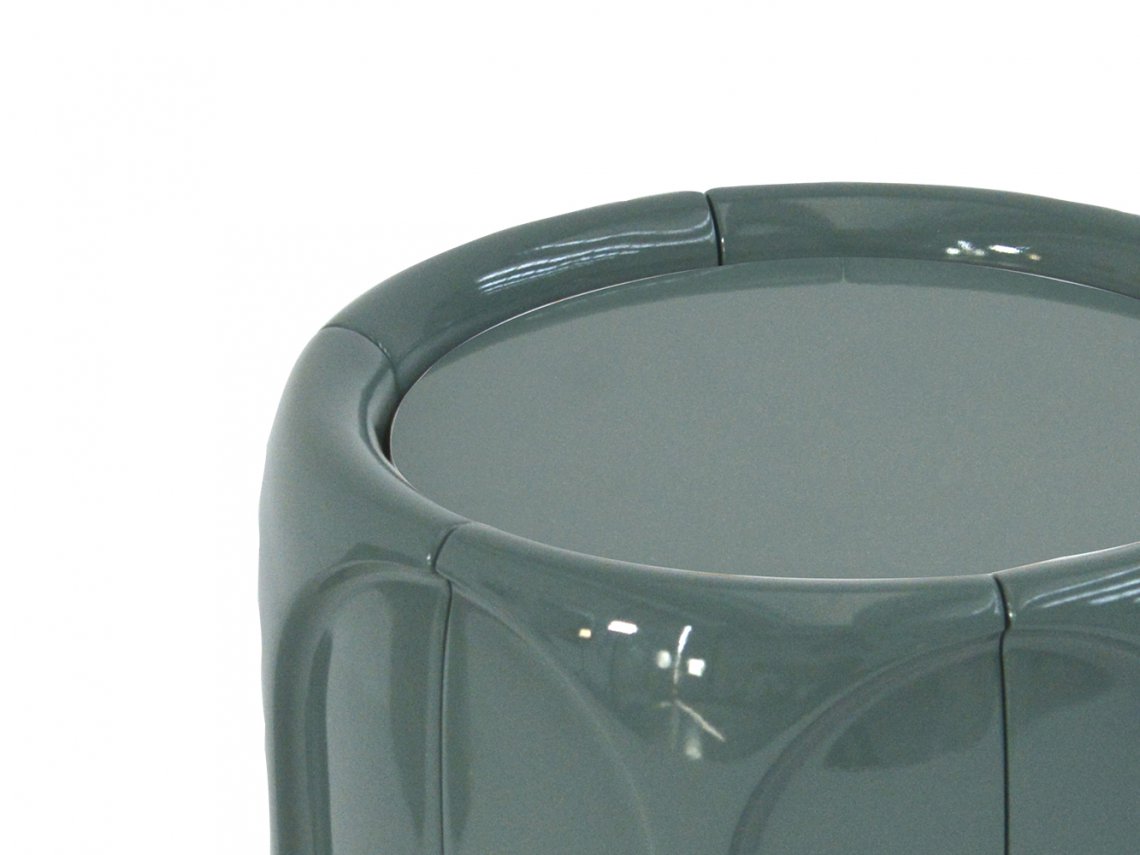 Concave coffee table enriches the living area with a sculptural touch and is characterized by a round shape embellished on the surface by many three-dimensional facets. It is available in various colours with a glossy or matt finish.