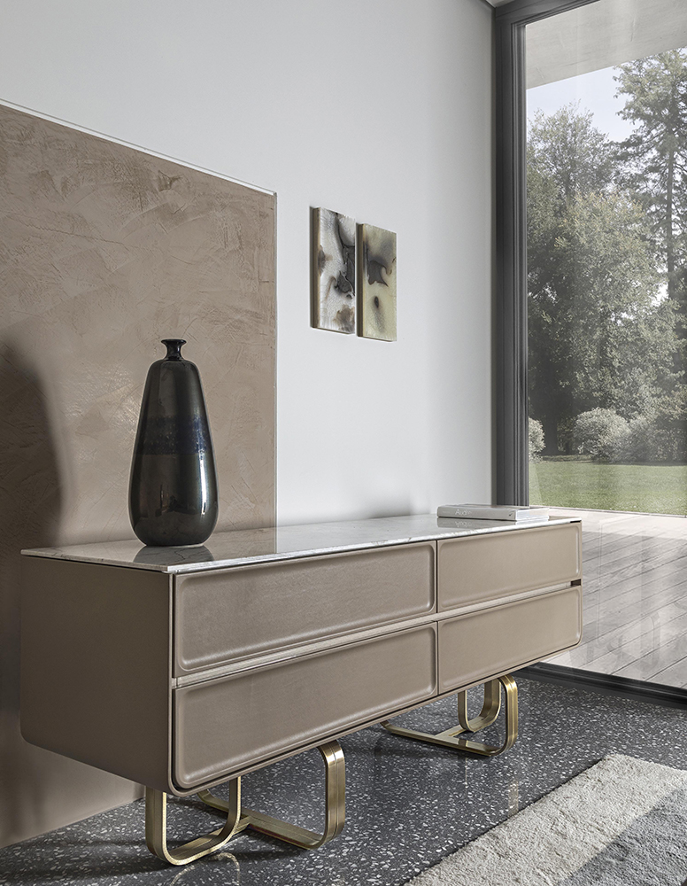 The drawer unit Nova with drawers and rounded shape can be considered the protagonist of the bedroom. The care to details is visible on the drawers decorated with three-dimensional frames upholstered with soft leather. The structure is supported by two metal bases that characterize the collection while the internal sides are made up of eucalyptus wood.