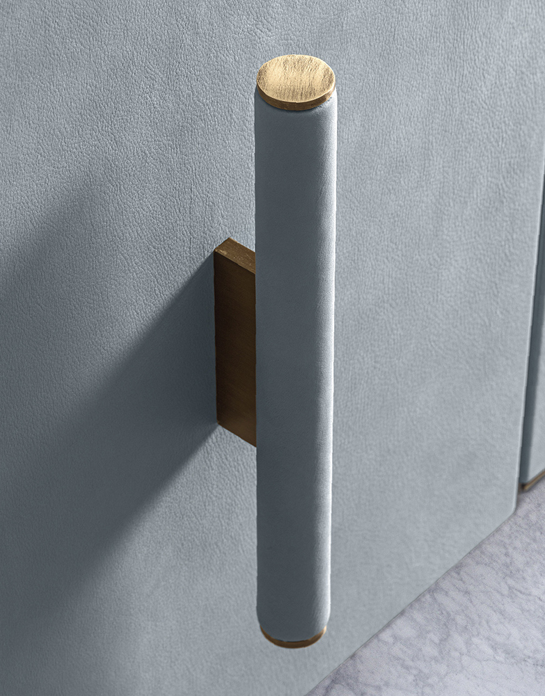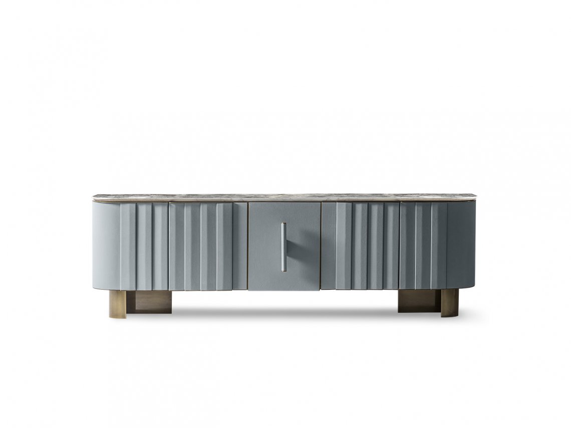 The doors of Morgan storage unit are shaped three-dimensionally with vertical decorative motif and upholstered in leather with “plissè” effect. The handle of the central door consists of a single cylindrical element placed in the center of the storage unit, while the side doors can be opened by pulling a metal plate that protrudes elegantly from the upper profile. Metal plays not only an aesthetic and functional role of door finishing, but is also present in the two elements that support the structure. Finally, the marble top has lowered edge to ensure an almost suspended effect compared to the underlying metal. The four-doors version of Morgan storage unit represents an interesting proposal for the living area.