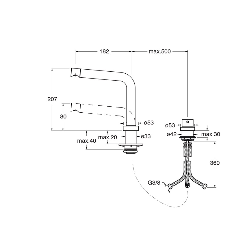 Single-control kitchen mixer, 2-hole telescopic swivel spout, deck-mounted, with mechanical front mixing, H. max 207 mm - min. 80 mm