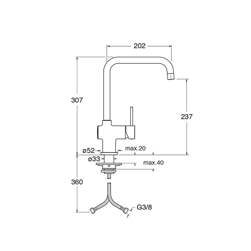Single-control kitchen mixer, swivel spout, single-hole deck-mounted, with right-hand side mechanical mixing. Smart water-saving (double click) and energy-saving (cold water in the vertical control position) opening system, H. 307 mm