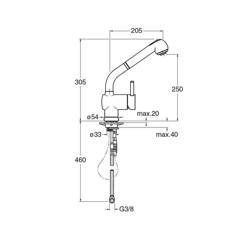 Single-control kitchen mixer, swivel spout, single-hole deck-mounted, with right-hand side mechanical mixing and detachable 2-jet mini showerhead, H. 305 mm