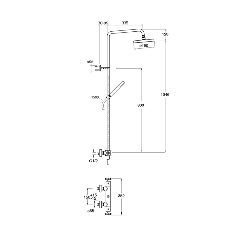 Wall-mounted “exposed” shower column, with thermostatic mixing, diverter with 2 outlets, inspectable anti-scale rain effect showerhead 190 mm, adjustable shower arm, anti-scale mini showerhead, sliding support and long-life hose
