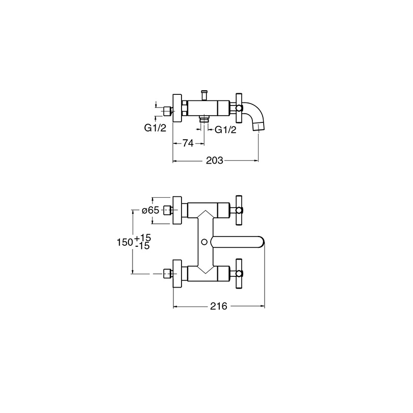 Dual-control wall-mounted external bath mixer, with mechanical mixing, automatic diverter with 2 outlets, spout length 203 mm