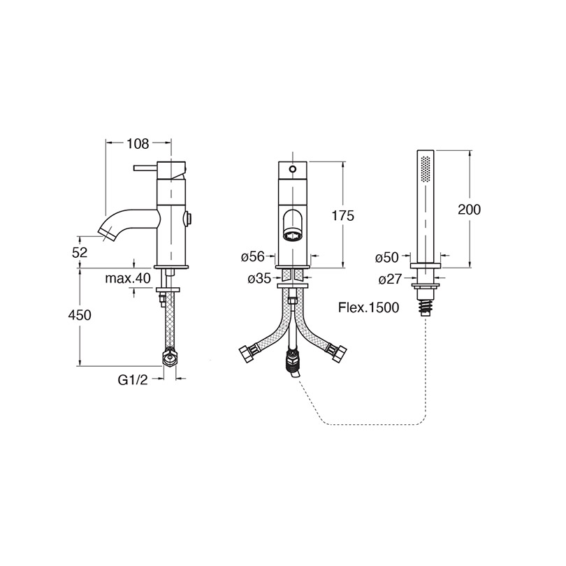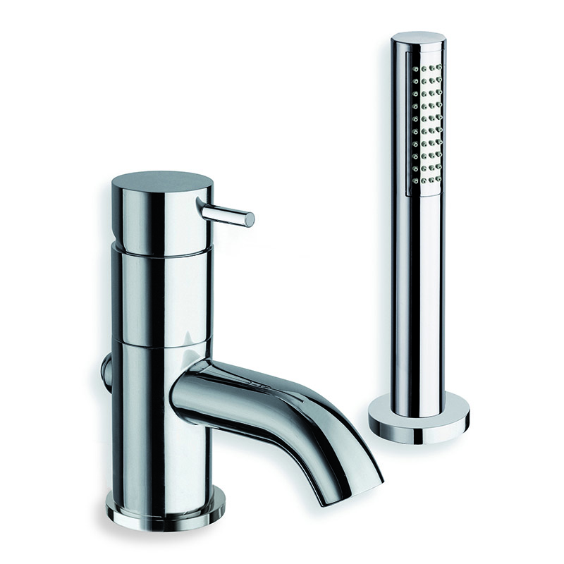 Inspectable single-control 2-hole deck-mounted bath edge mixer, with mechanical mixing, diverter with 2 outlets, detachable anti-scale mini showerhead and FOLLOW ME *****, complete with recessed part