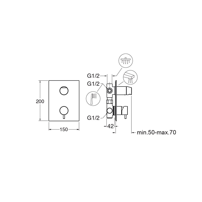 Vertical single-control wall-mounted shower/bathtub mixer, metal plate, with mechanical mixing, diverter with 3 outlets, complete with recessed part