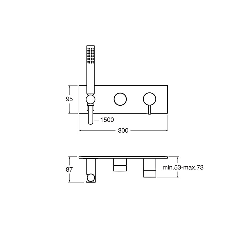 Single-control wall-mounted external set for shower/bathtub, metal plate, with mechanical mixing, diverter with 2 outlets, fixed support, water outlet, anti-scale mini showerhead and long-life hose ****. For completion with recessed part CRICS100 (RH) / C
