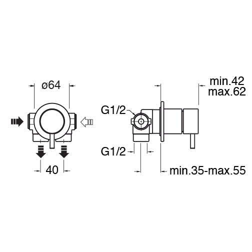 Wall-mounted diverter with 2 outlets, round metal plate, complete with recessed part