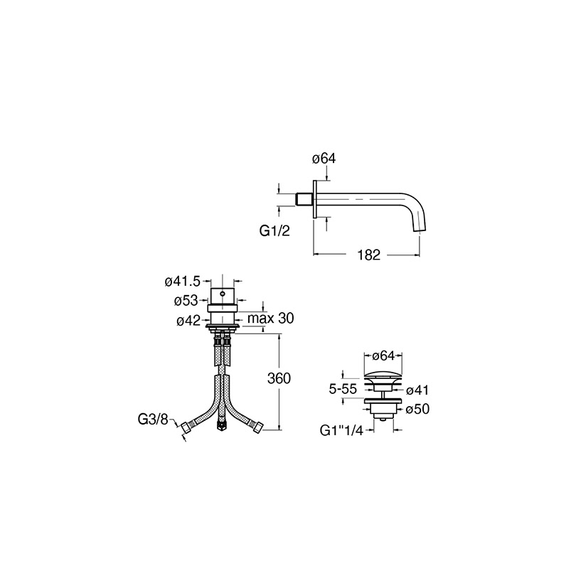 Single-control wall-mounted Regular Washbasin mixer, with relocatable mechanical mixing and 1" 1/4 U&D* drain. Spout length 182 mm