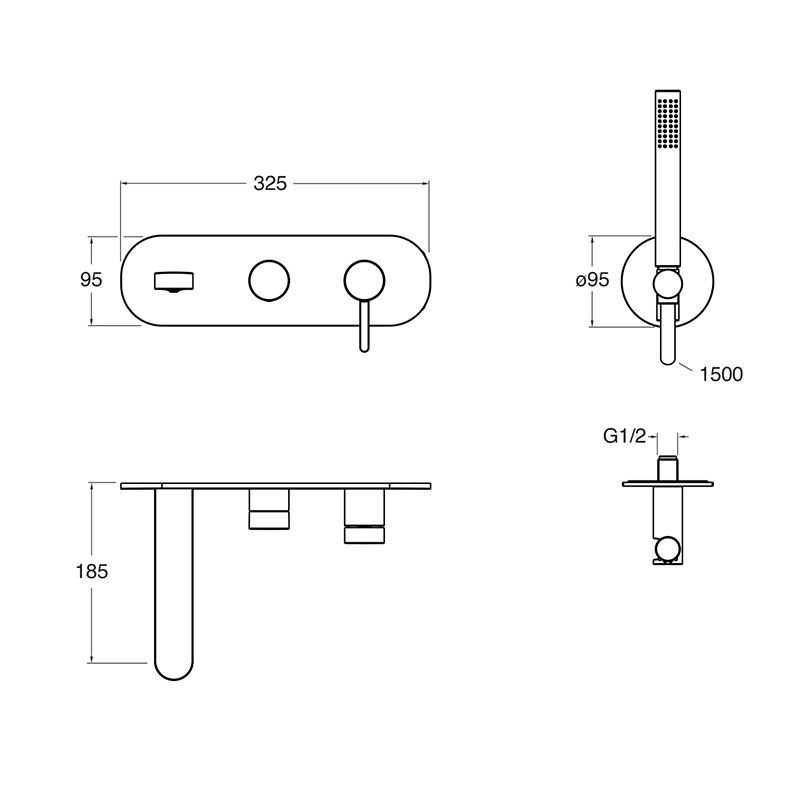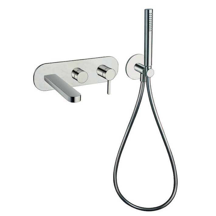 Single-control wall-mounted external set for bathtub, metal plate, with mechanical mixing, diverter with 2 outlets, spout length 185 mm, anti-scale mini showerhead, fixed support, water outlet and long-life hose ****. For completion with recessed part CRI