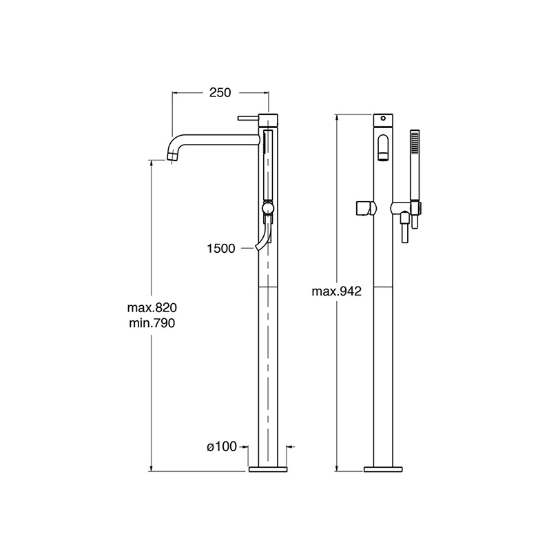 Single-control floor-standing external set for bathtub, with mechanical mixing, spout, anti-scale mini showerhead with independent mechanical mixing and long-life hose ****. For completion with recessed part CRICS290