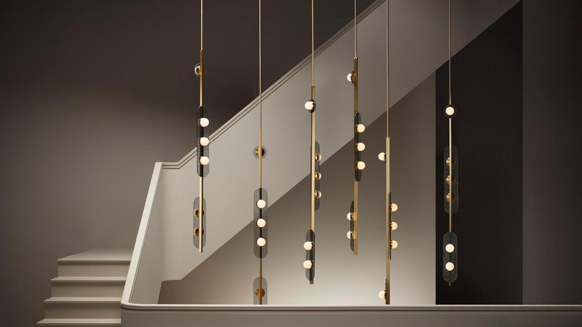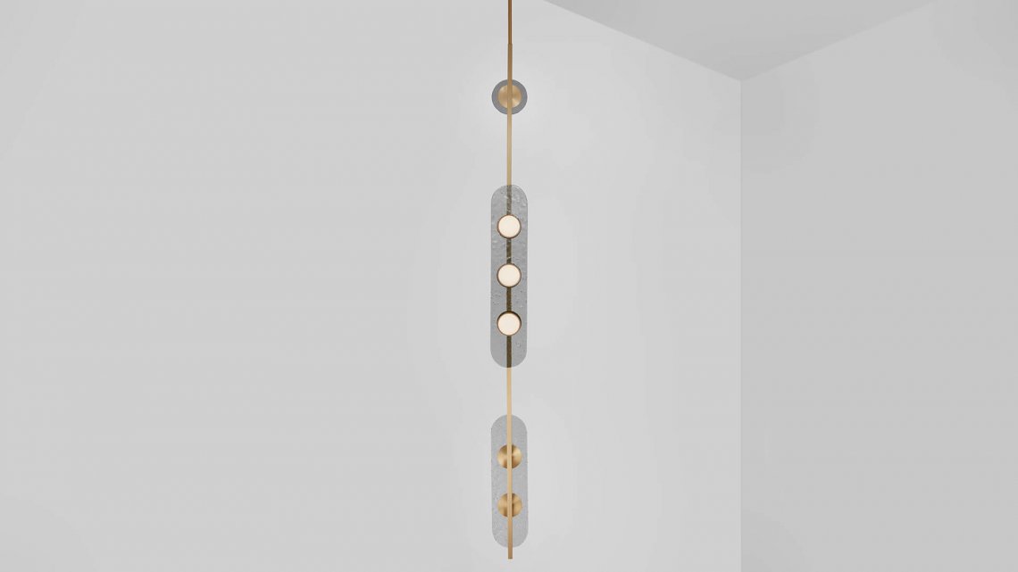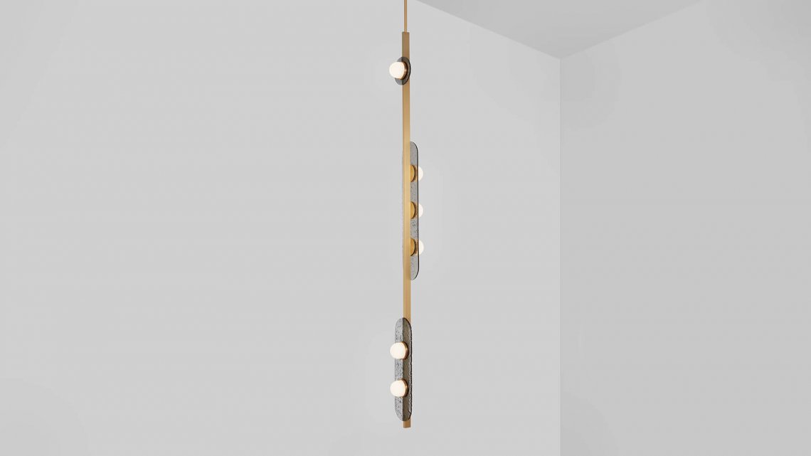 Created for CTO Lighting by Italian designer Federico Peri, MODULO is a collection of chandelier, pendant and wall lights distinguished by its modular form, arranged in linear configurations creating versatile lighting sculptures. Combining functionality with artisanal skill, the design focuses on geometric forms, connected in compositions of modules. The glowing domes are spaced in a linear pattern, allowing the light to reflect along the transparent, elongated glass disc and metal frame.