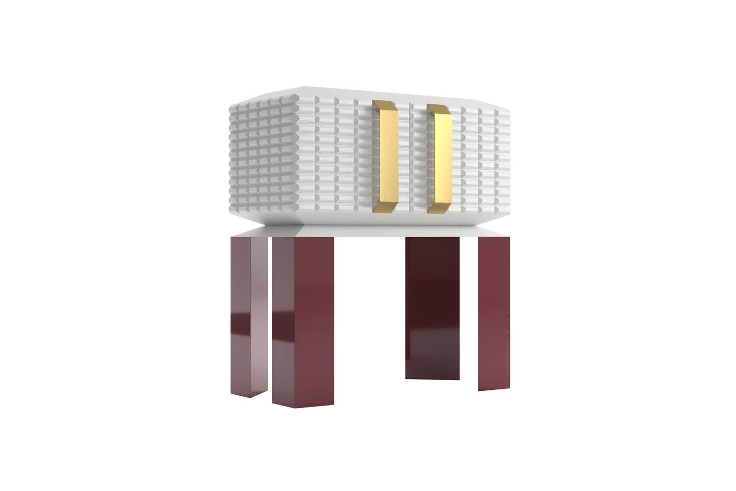 The structure of this container is made of white matt lacquered wood, the legs are bordeaux coloured, while the handles are made of satin copper.