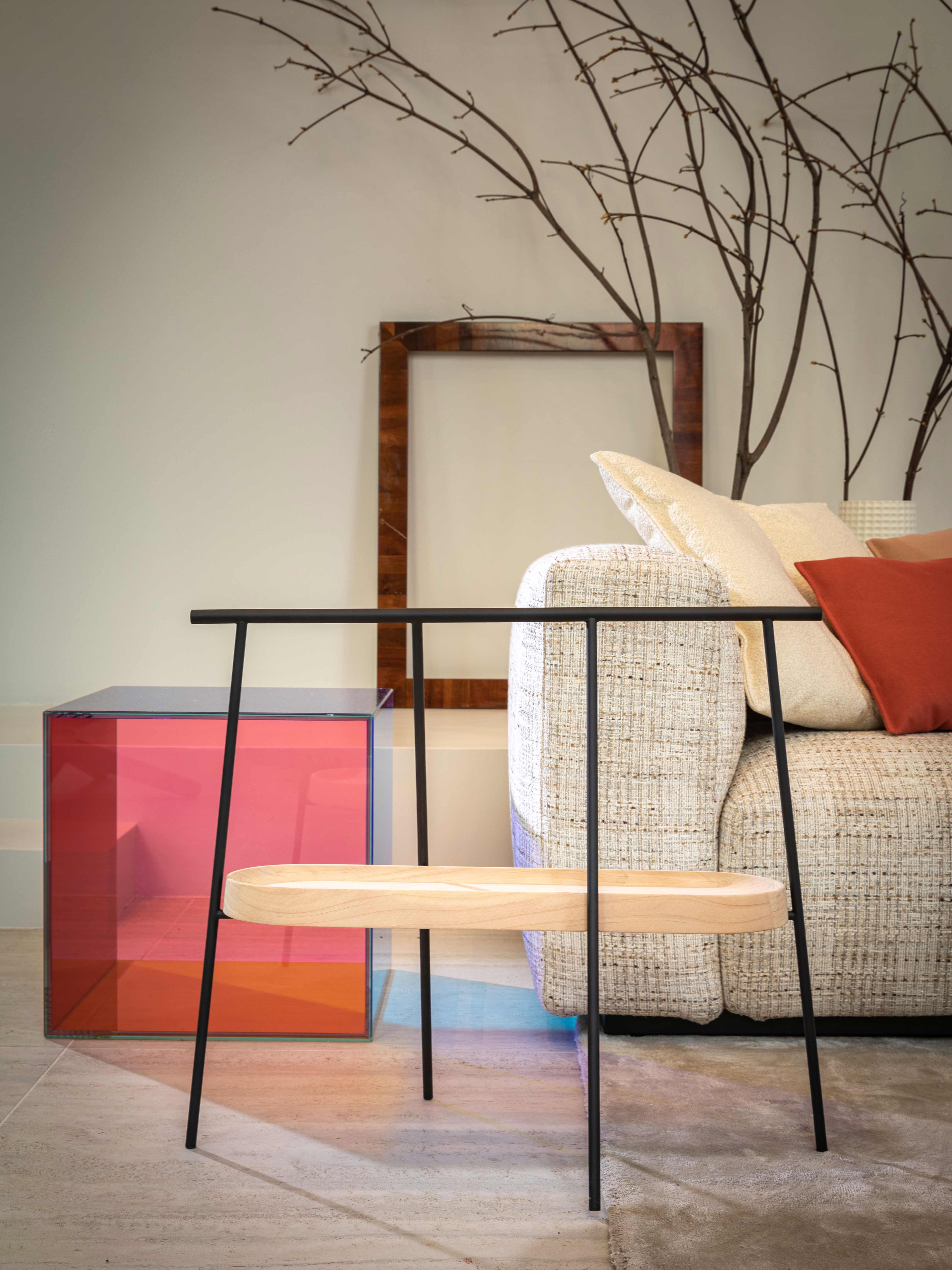 Available in different dimensions, the Pinch service tables feature a structure made of black matt painted metal tubes, while the trays are made of solid cedar wood, available in raw natural or black-stained finish, or can come with a textured finish in white, slate or wagon green colour.