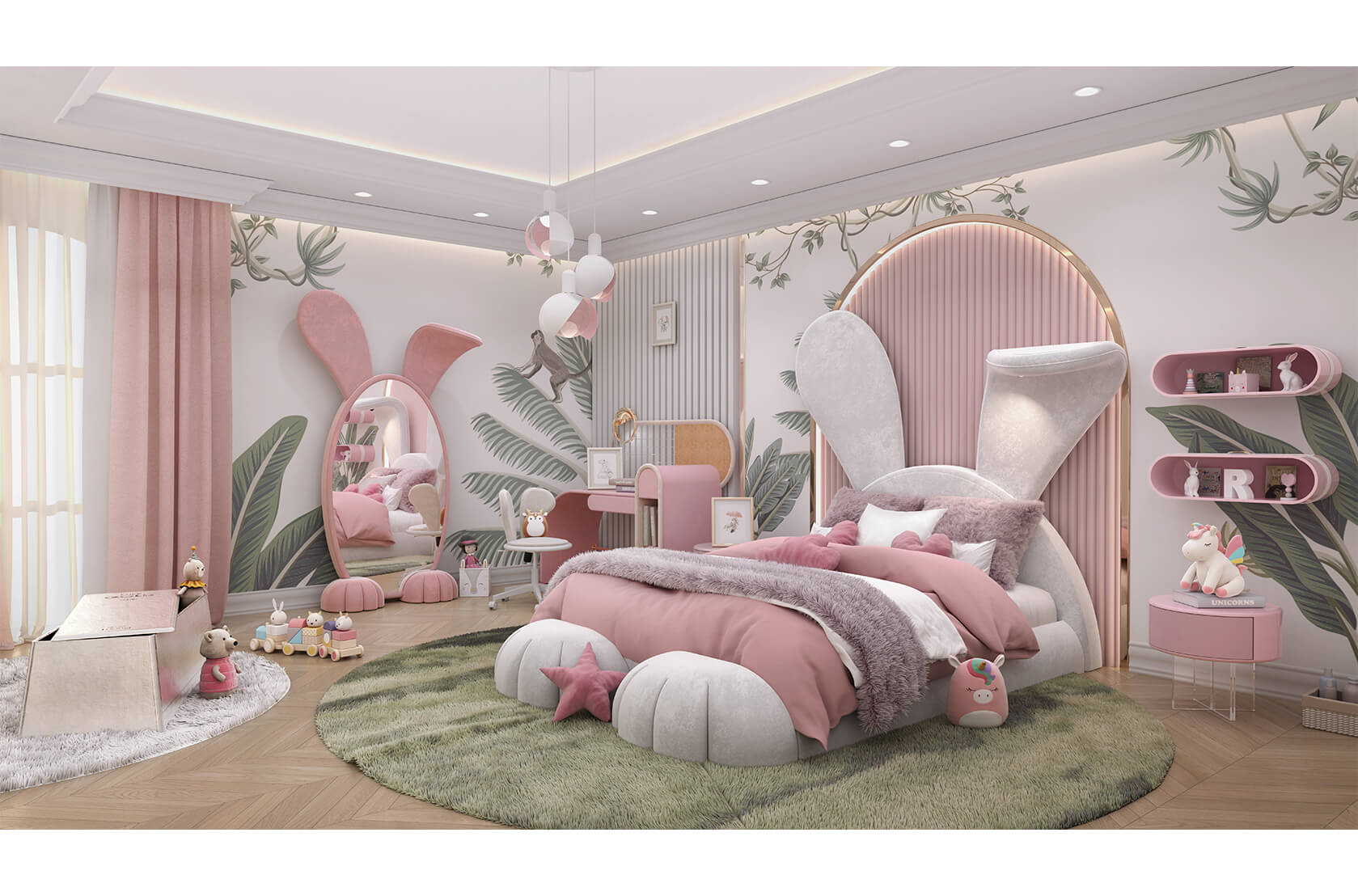 Inspired by the iconic character BugsBunny, the most famous and playful bunnyin the world, the Little Bunny Chair is hereto add more fun to your kid’s bedroom. With its shaped ears design combined withits translucid acrylic legs, this chair willgive you the illusion of being suspendedon the hair, making it a fun featured to addto your project. By using white synthetic furthe Little Bunny will also be a comfortableseating option for any kid’s study area.