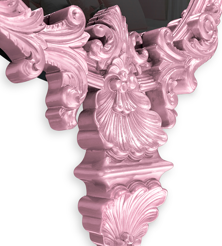 Made entirely by hand, using traditional techniques of carving, it features silver leaf finishes with pink translucent varnish applied.