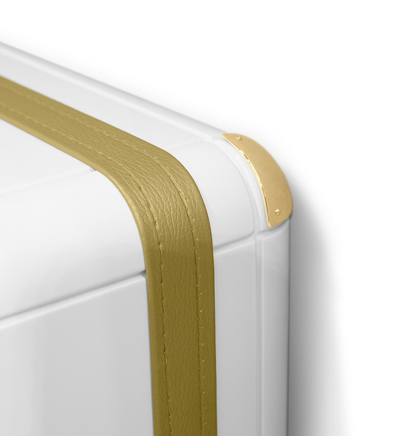 Built in wood, lacquered in glossy white, with details in synthetic leather and gold/silver plated finishes.