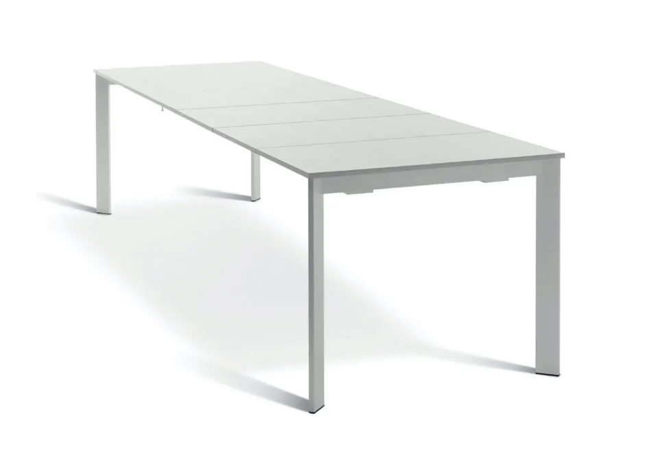 Santorini is a modern extendable table with telescopic opening. It has a metal frame painted white or grey and the material and colour of the tabletop can be customised.
